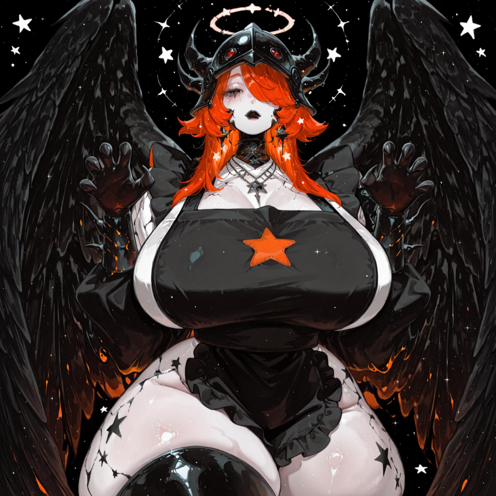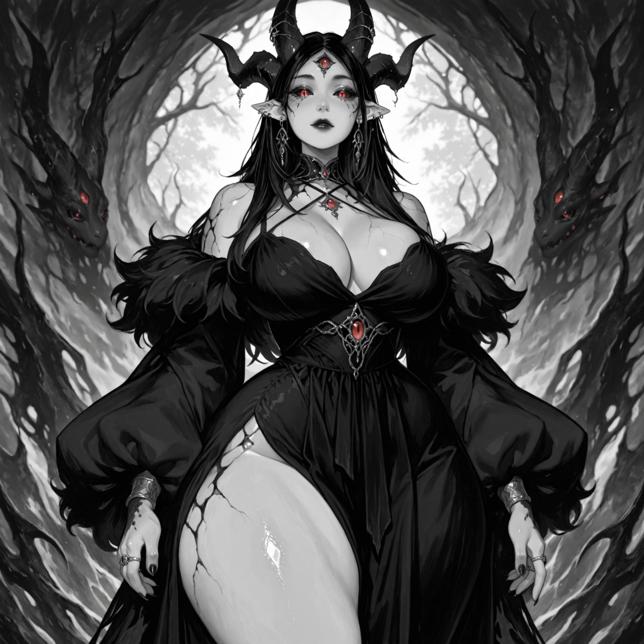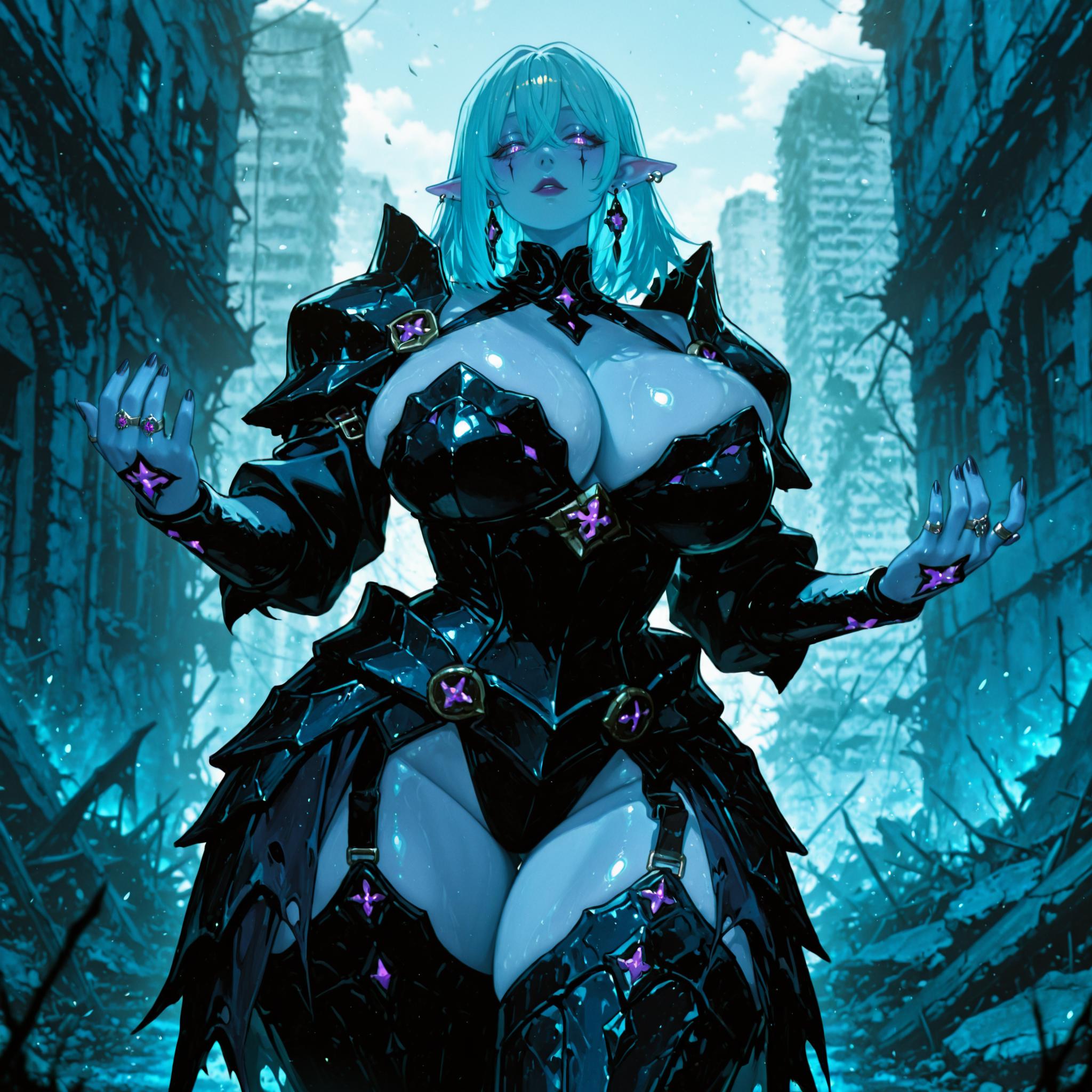 monster_girl, 1girl, solo,huge breast, looking at viewer,large breasts, jewelry, colored skin, cleavage, earrings, pointy ears, ring, big thighs