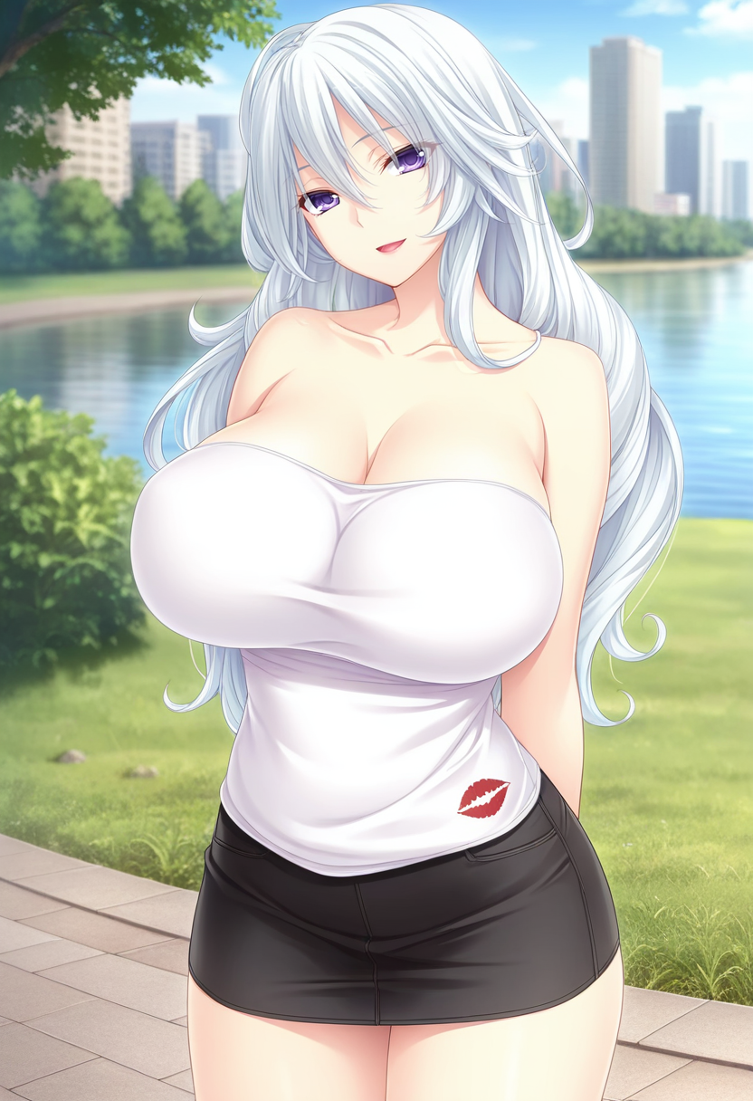 3 collarbone, cleavage, strapless shirt, white shirt, black skirt, miniskirt