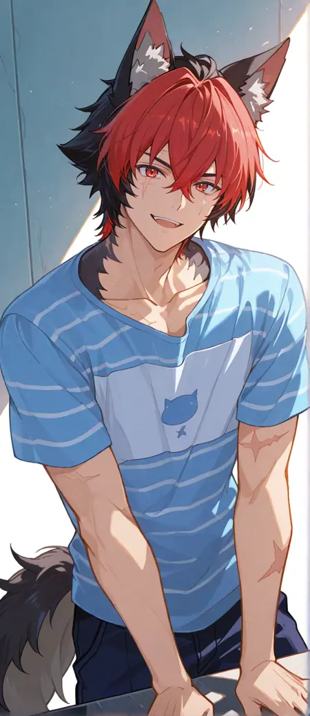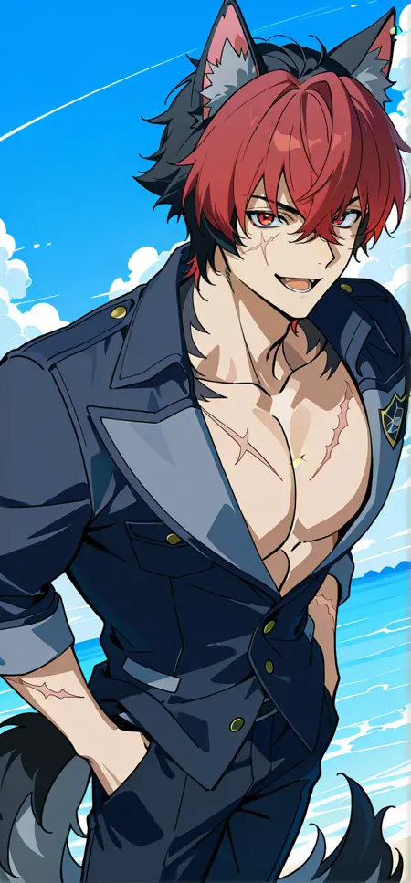 Trigger words: komano manato,black hair,red hair,multicolored hair,two-tone hair,short hair,animal ears,red eyes,scar,hair between eyes,wolf boy,animal ear fluff,scar on face,scar on arm,scar on chest,wolf tail,dark skin,scar across eye,multiple scars