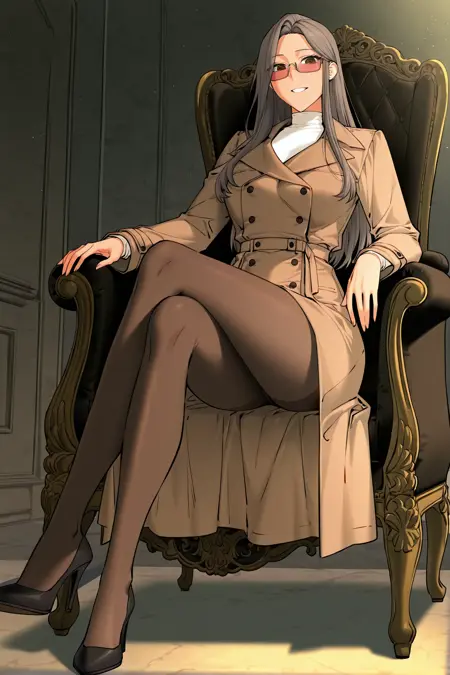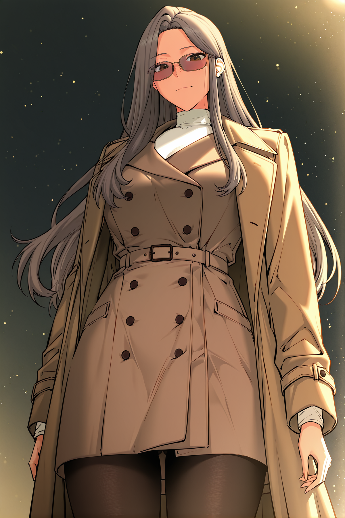 조나_아이템6, 갈색 코트, 더블 브레스티드 코트, 벨트 코트, 흰색 터틀넥, 검은색 팬티스타킹, 검은 하이힐, 틴트된 안경, 직사각형 안경,