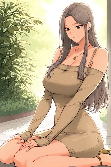 조나_아이템2, 베이지 드레스, 어깨 드레스, 어깨노출 소매, 긴 소매, 손목까지 덮는 소매, 붙이는 드레스, 베이지 안토, 어깨 끈, 골드 목걸이, 둥근 펜던트, 베이지 하이힐, 발목 끈 하이힐,