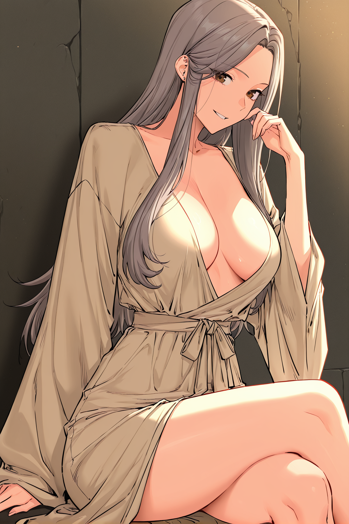 조나_아이템3, 베이지 로브, 깊은 네크라인, 긴 소매, 끈으로 묶은 허리 벨트, 베이지 치마, 맨발,