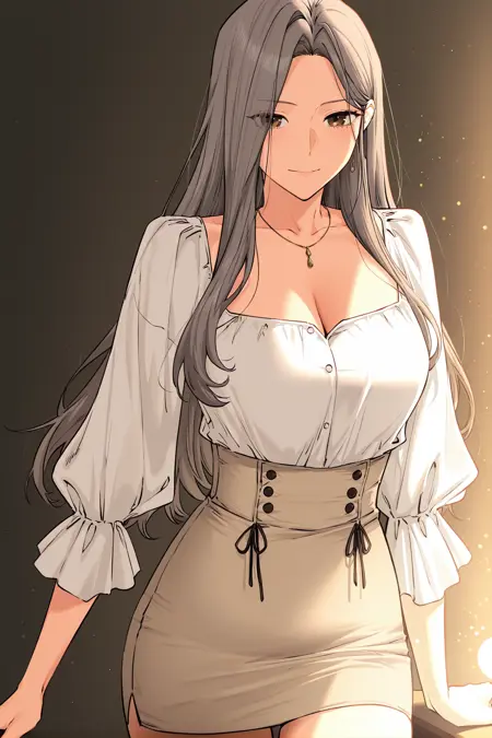 조나_아이템4, 흰색 블라우스, 퍼프 소매, 베이지 치마, 높은 허리 치마, 단추 달린 치마, 짧은 치마, 목걸이,