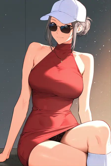 조나, 1소녀, 솔로, 갈색 눈, 회색 머리카락, 옆머리, 머리 땋기, 흰색 모자, 검은 선글라스,