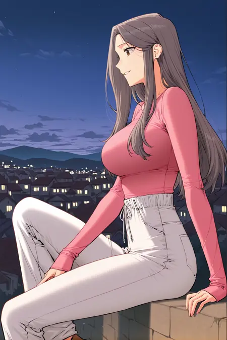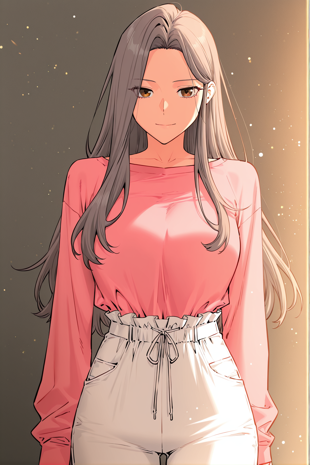 분홍색 상의, 긴 소매, 손목을 넘는 소매, 핏된 상의, 흰색 바지, 끈으로 조이는 허리, 느슨한 바지,