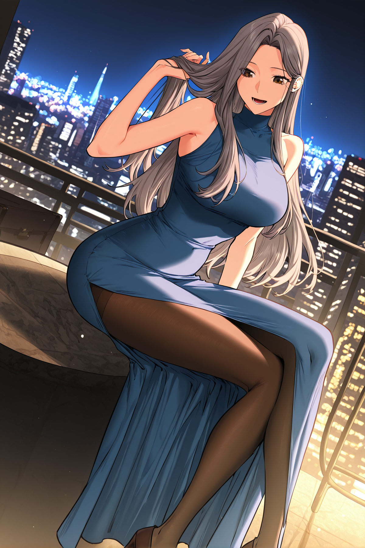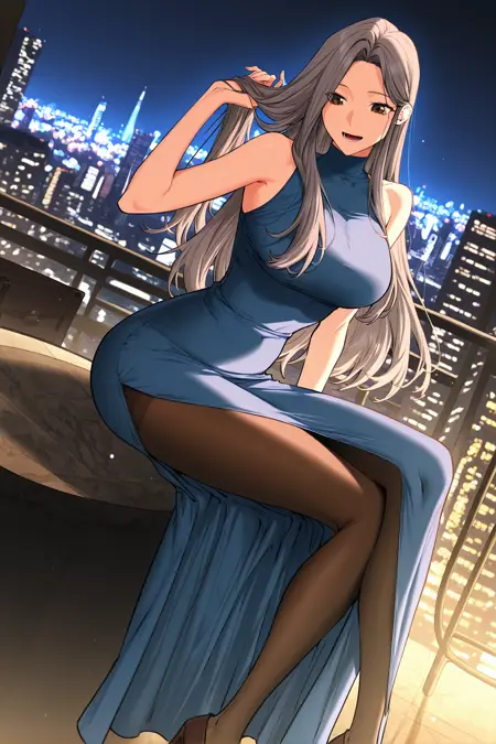 조나_아이템1, 파란색 드레스, 어깨없는 드레스, 높은 칼라, 긴 드레스, 측면 슬릿, 검은색 스타킹, 갈색 하이힐,