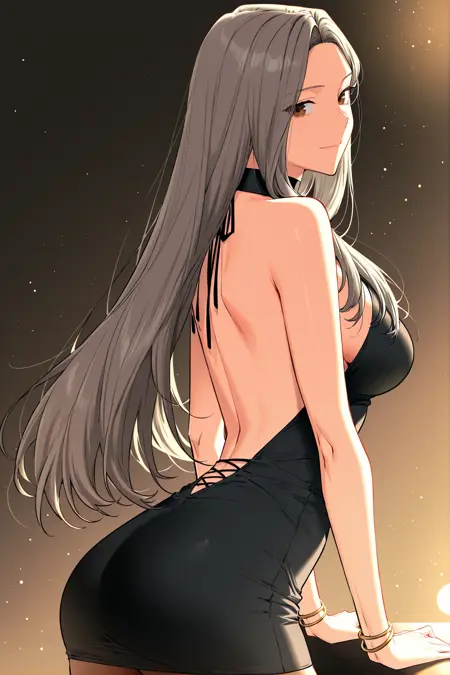 조나_아이템5, 검은 드레스, 어깨없는 드레스, 해터넥, 뒷면 노출 드레스, 짧은 드레스, 골드 팔찌,