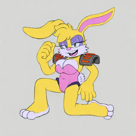 Buns Rabbot, Moebian rabbit, yellow fur, green eyes, white snout, stubby white tail, shoulder guards, pink leotard,