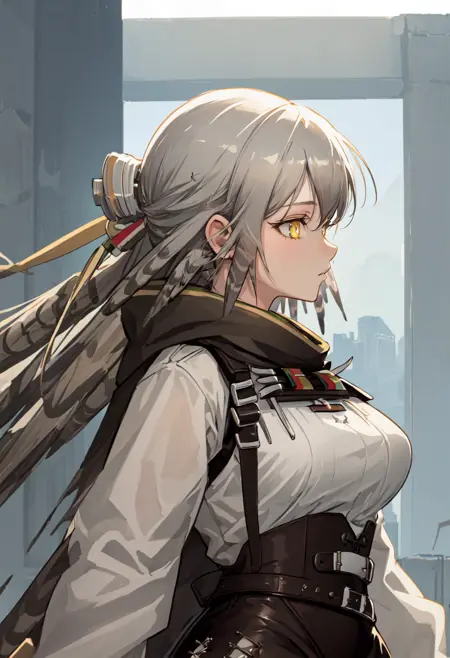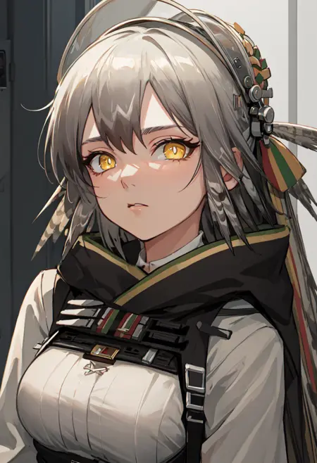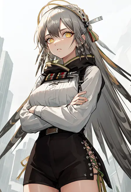 • The pruned character tags are long hair, yellow eyes, grey hair, breasts, feather hair, medium breasts. You can add them into prompts when core features (e.g. hair color) of character is not so stable.