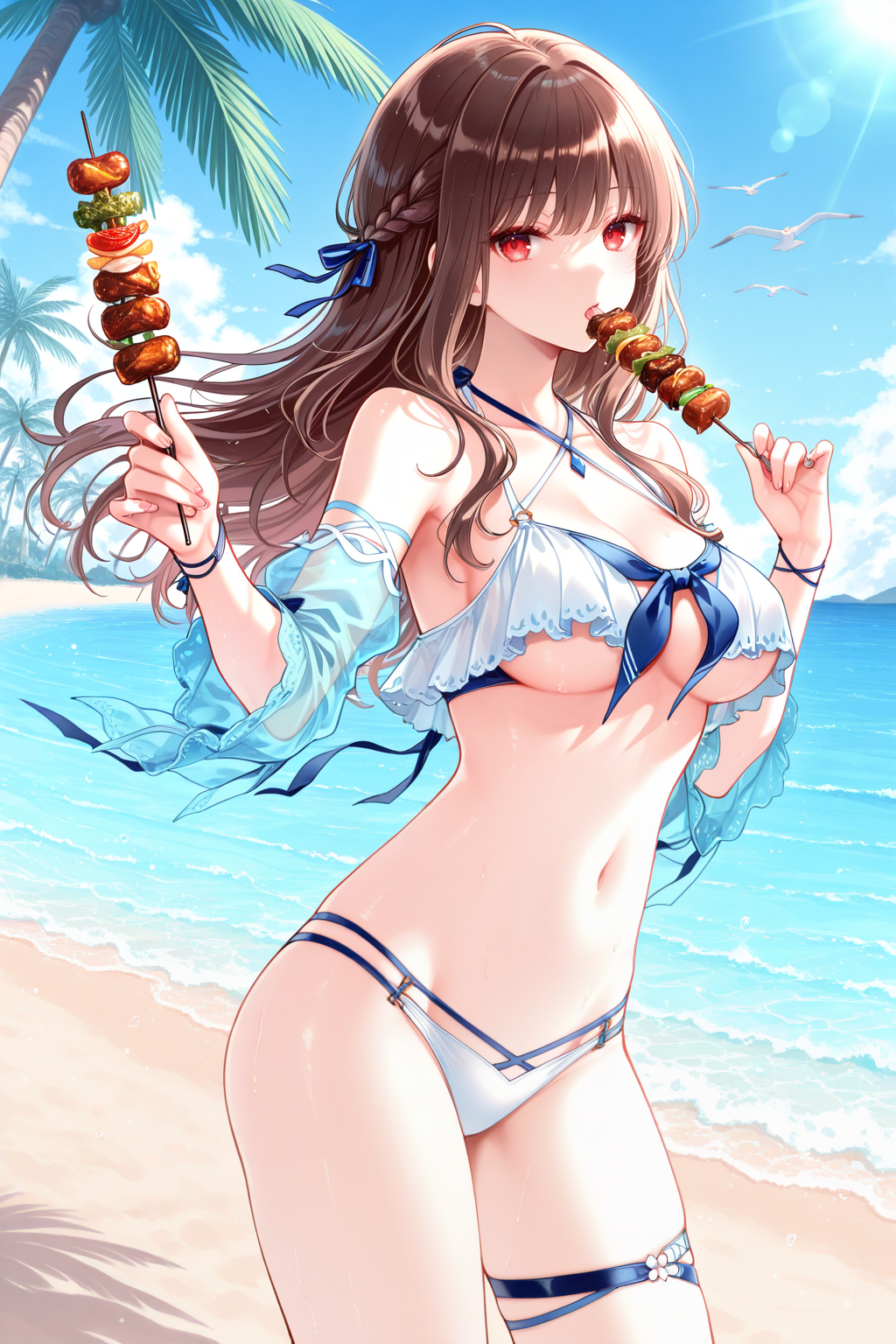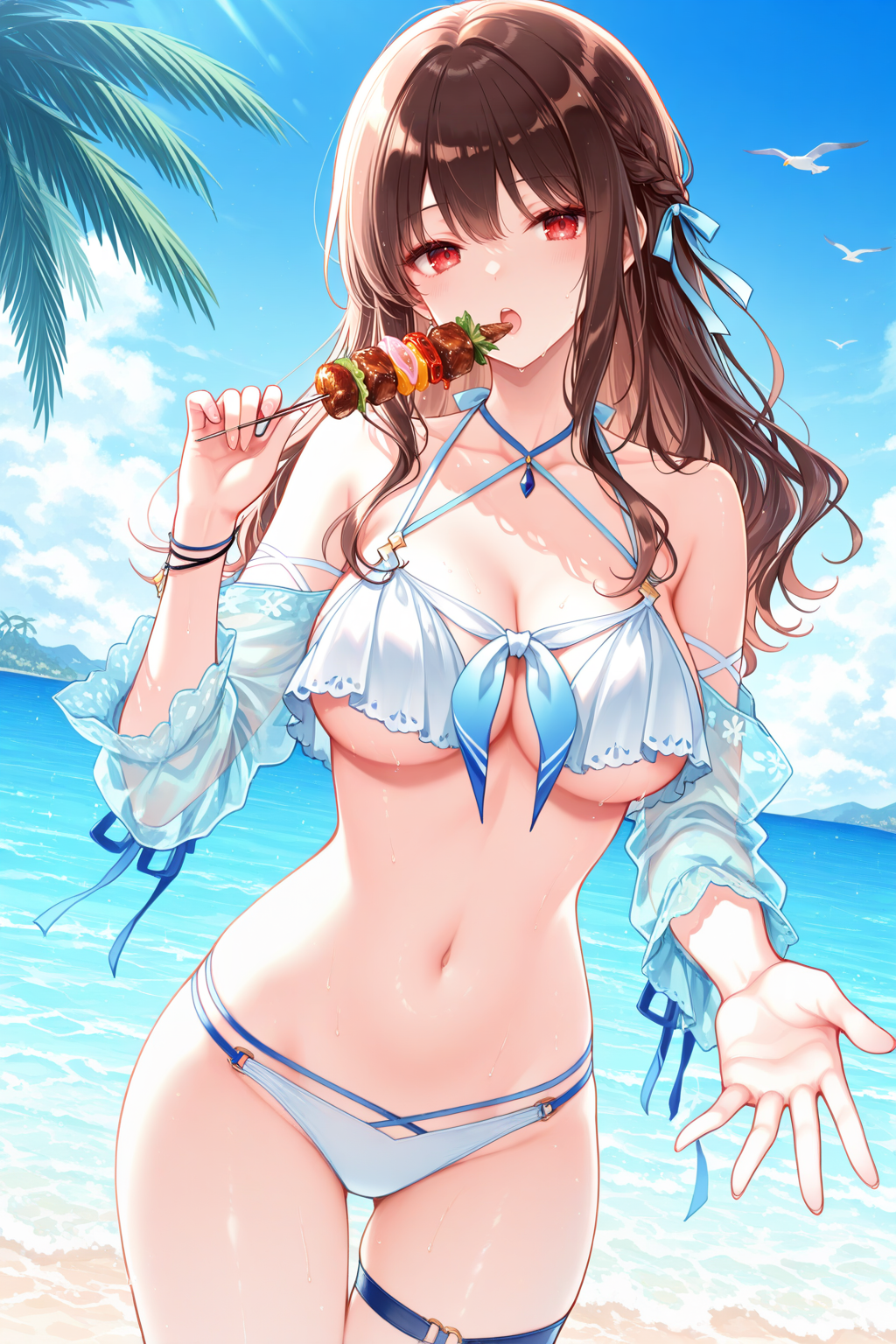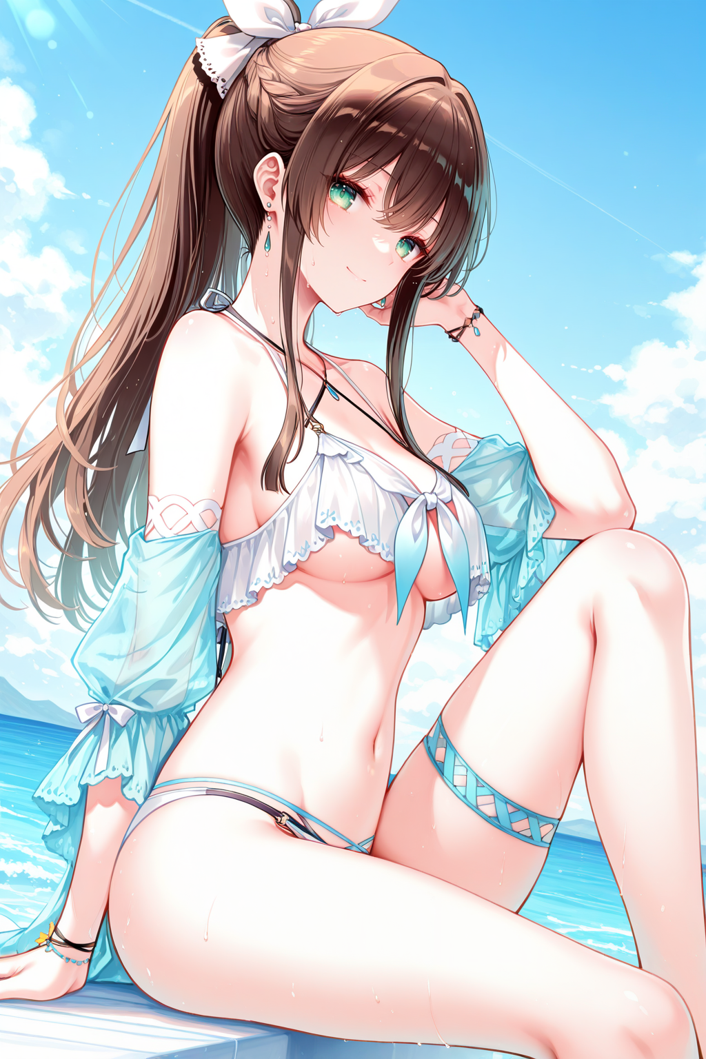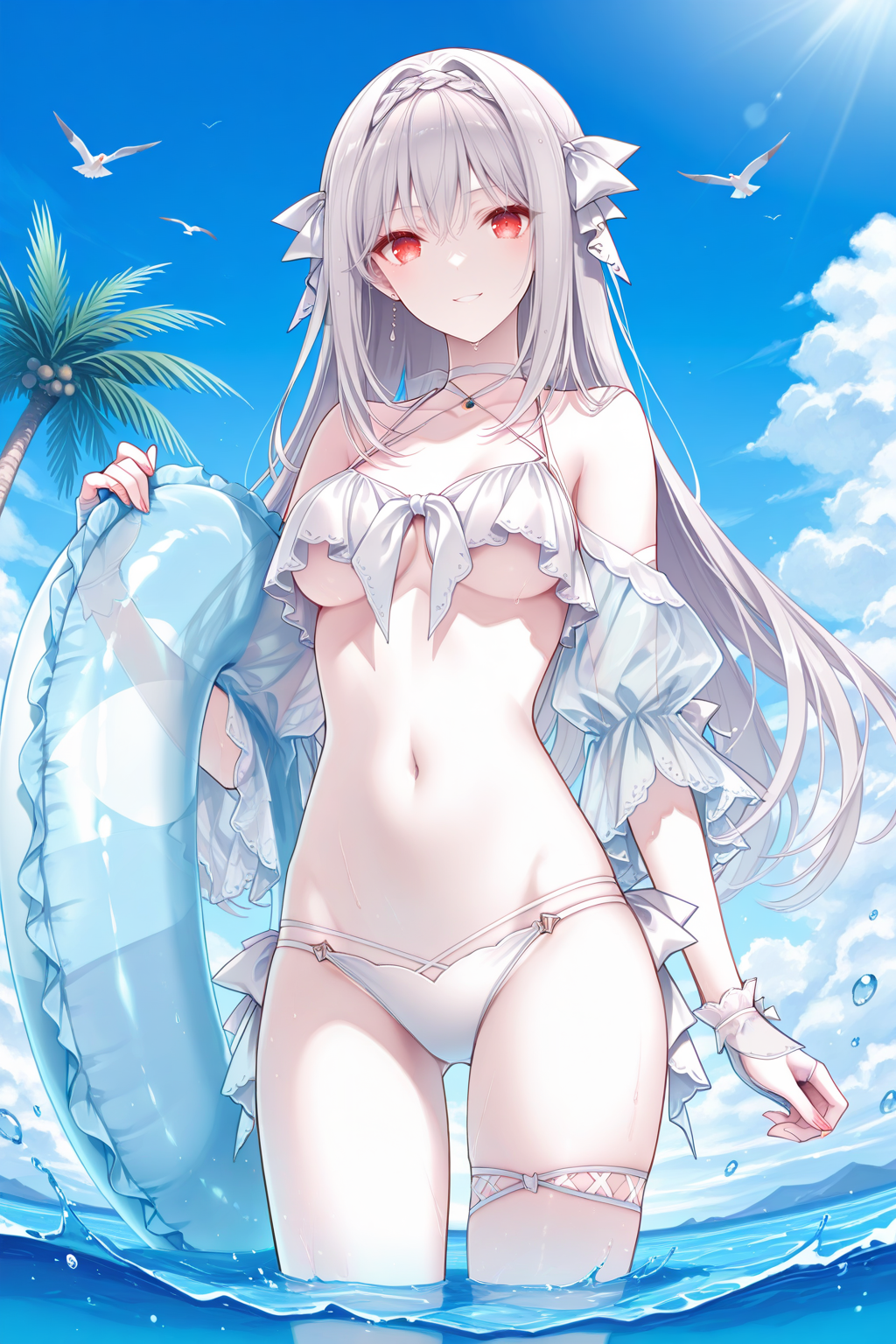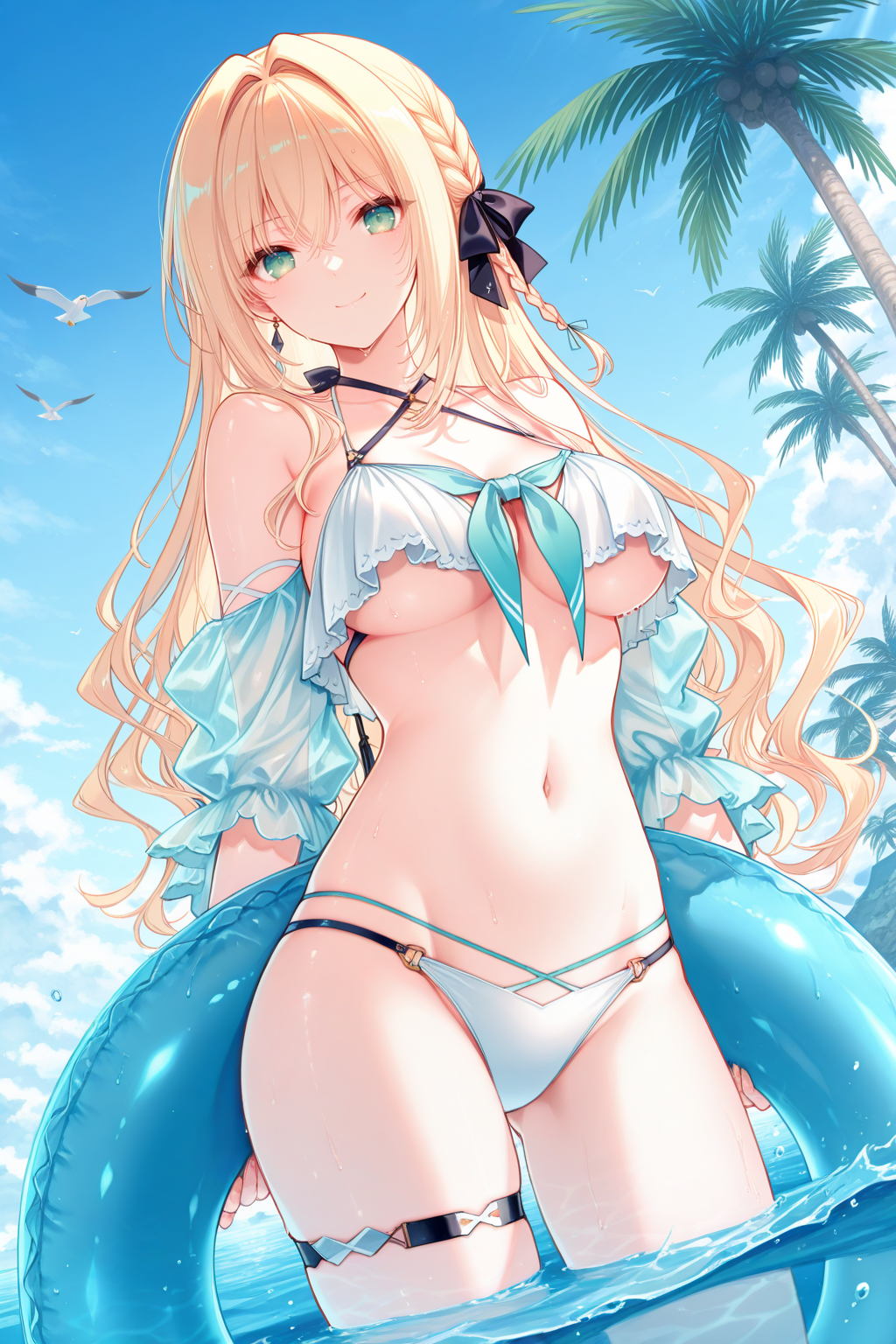 siris \(水着\)、水着、白いビキニ、太ももストラップ、肩出し、アンダーブラスト、胸のカーテン、ストリングビキニ、透け感のある袖、
