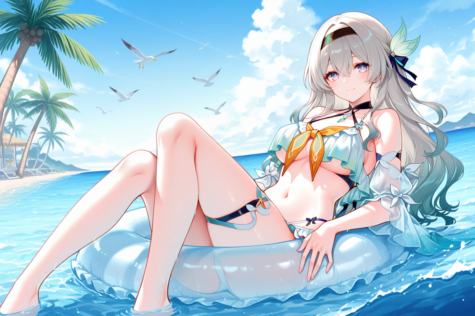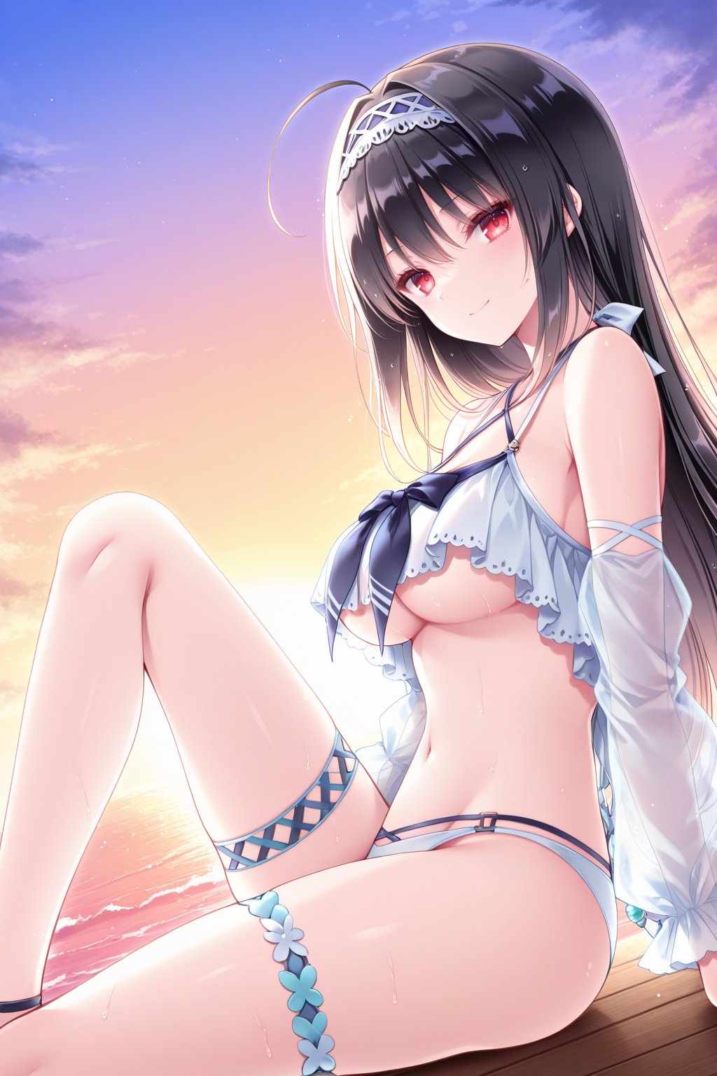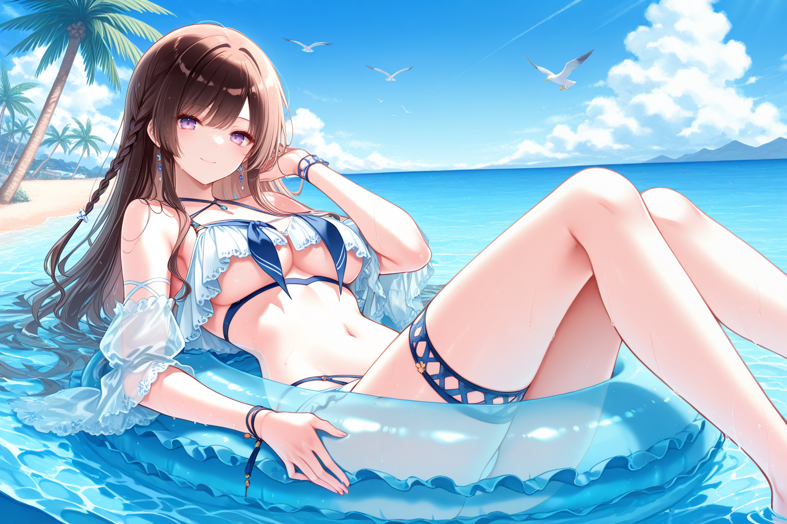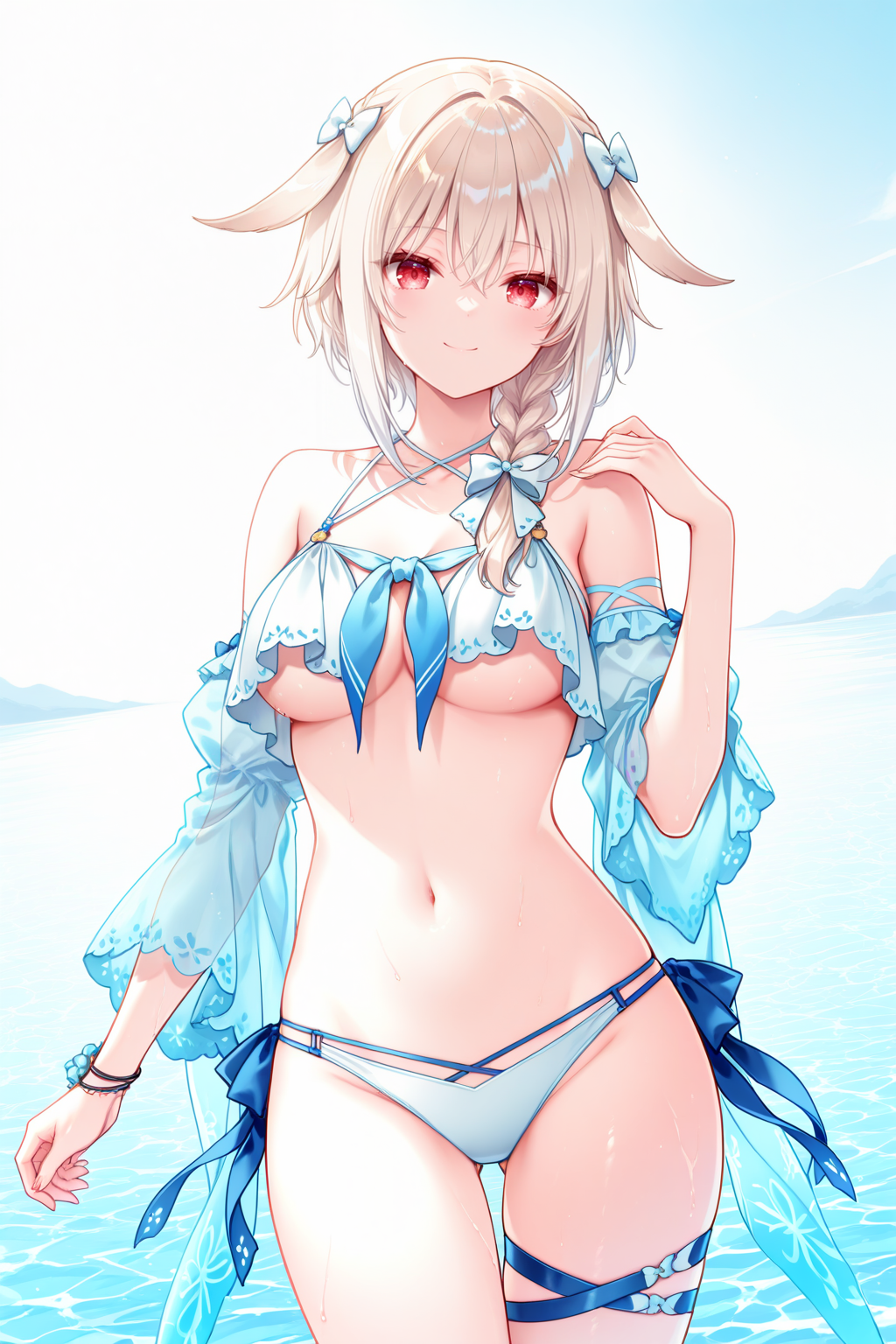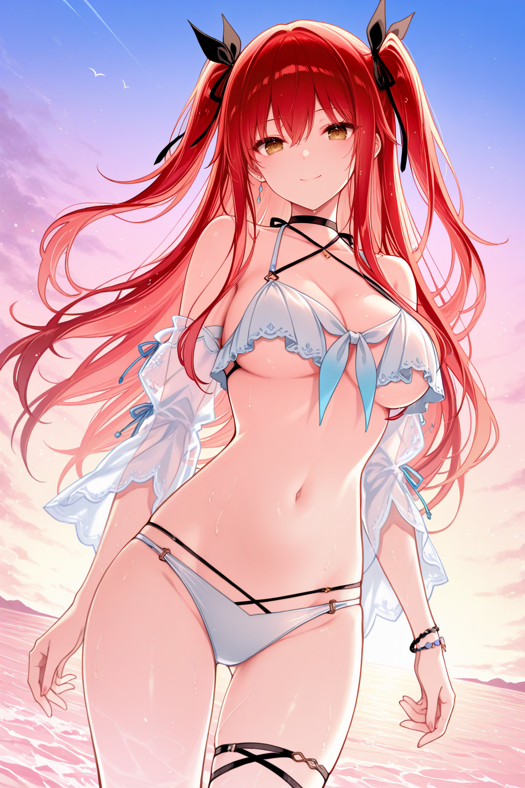 siris \(水着\)、水着、白いビキニ、太ももストラップ、肩出し、アンダーブラスト、胸のカーテン、ストリングビキニ、透け感のある袖、