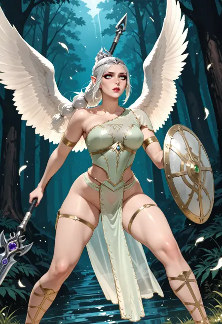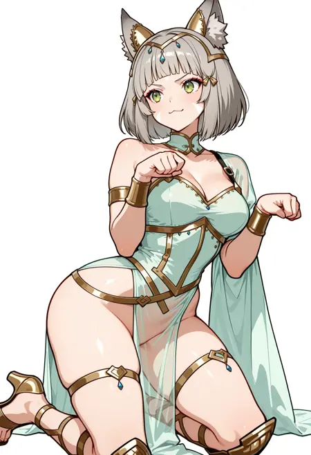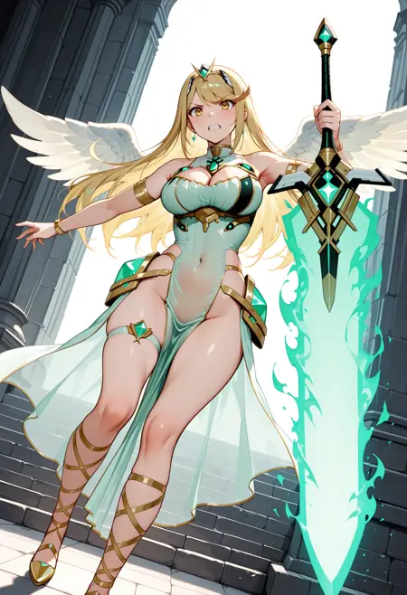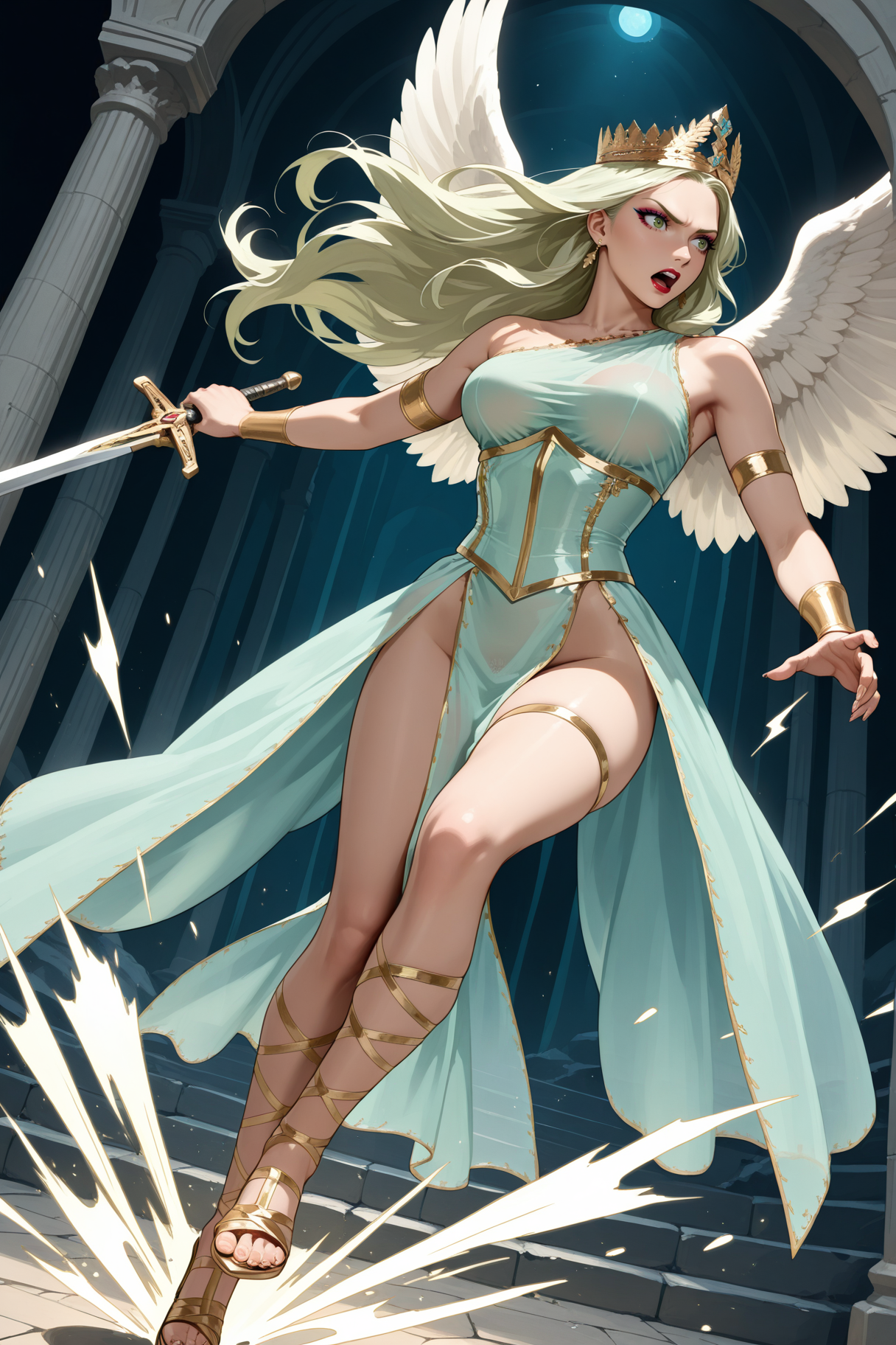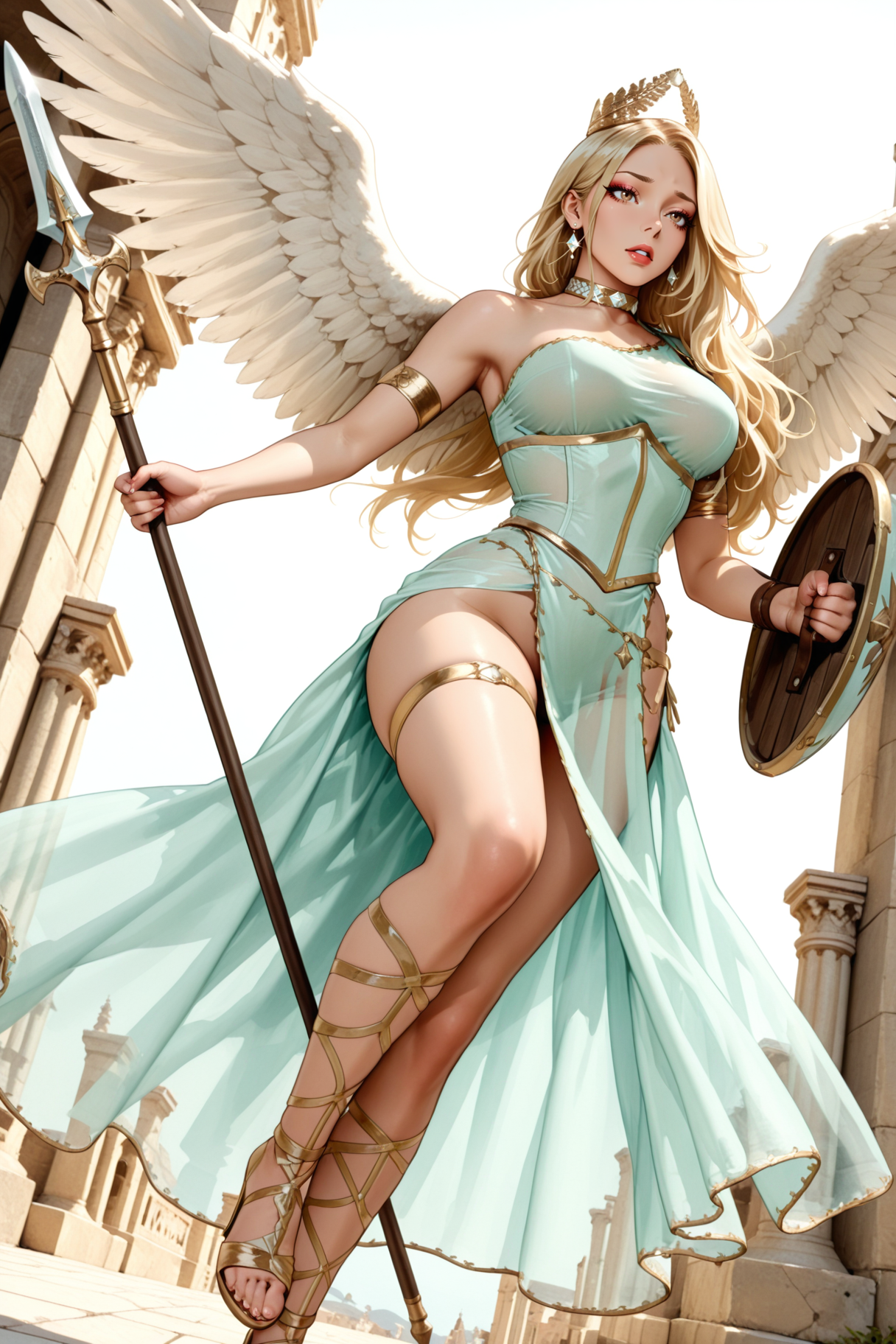 연한 녹색 드레스, 골드 트림, 골반 커튼, 비대칭 드레스, 가린 젖가슴, (비대칭 상의), 허벅지, 투명 드레스, 팔찌, 속옷 없음, 그리스 복장, 글래디에이터 샌들, 골드 힐, 메이크업, 왕관, 보디스, 흰색 천사 날개, 허벅지 스트랩