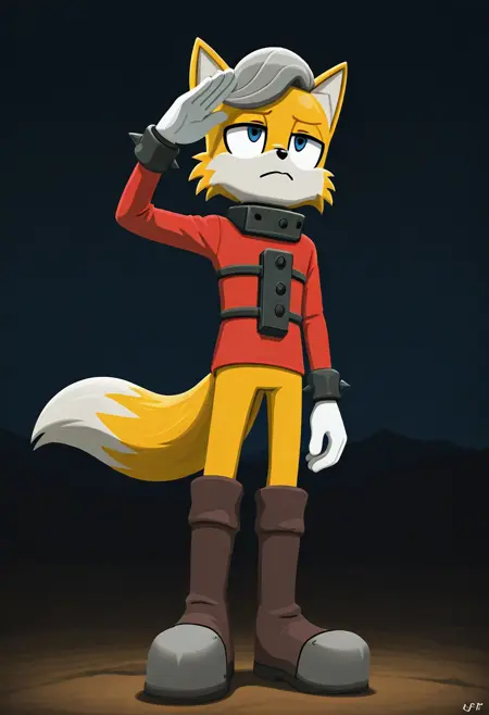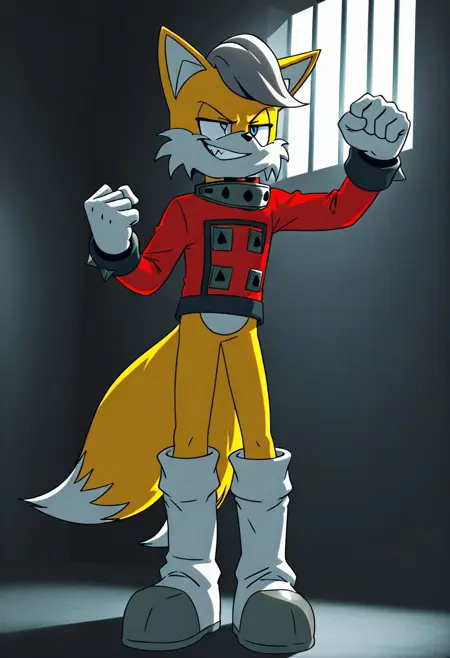 Anti-Tails the fox, yellow fur, blue eyes, gray tuft of hair, two tails, red shirt, white trimming, no pants, white gloves, red and white boots