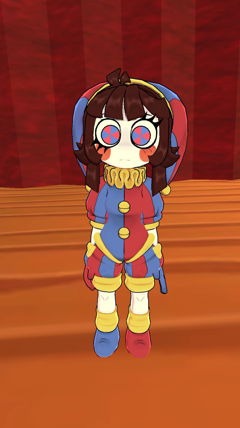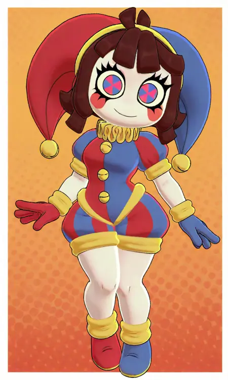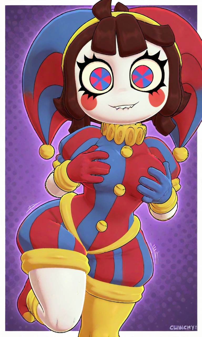 Tags: crunchy_pomni, white skin, brown hair, blush stickers, blue-red eyes, symbol-shaped pupils, jester outfit, bells, jester cap, blue gloves, red gloves, blue shoes, red shoes, yellow ruffle collar, mismatched outfit, yellow cuffs.