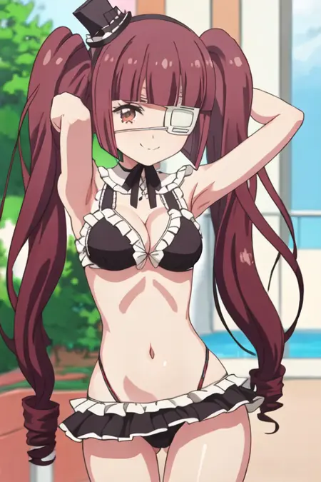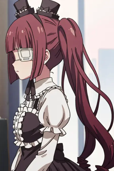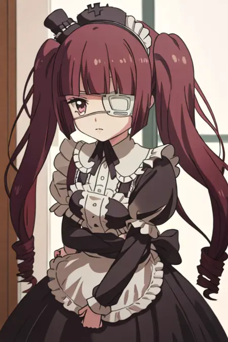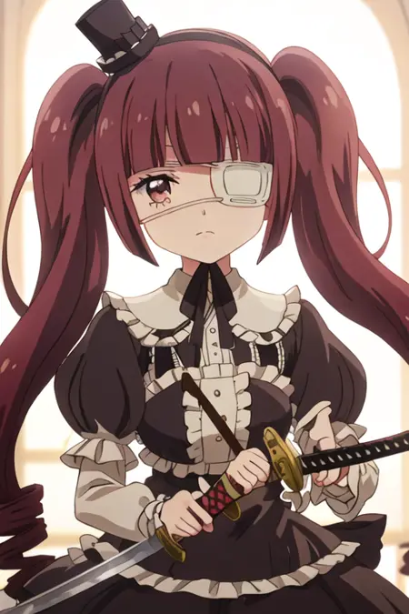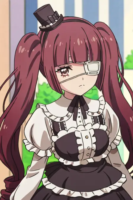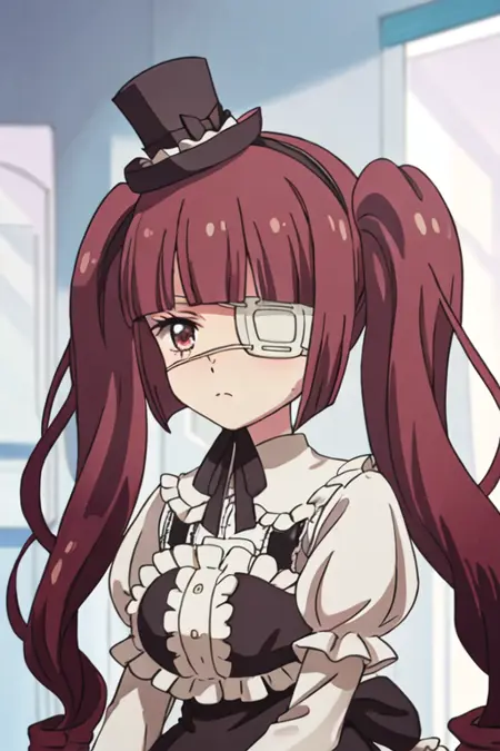 The trigger word is hua_yuan_yurine_jashinchandropkick, and the recommended tags are best quality, masterpiece, highres, solo, {hua_yuan_yurine_jashinchandropkick:1.15}, long_hair, twintails, eyepatch, medical_eyepatch, bangs, mini_hat, hat, lolita_fashion, gothic_lolita, red_hair, closed_mouth, brown_eyes, ribbon, brown_hair, black_headwear.