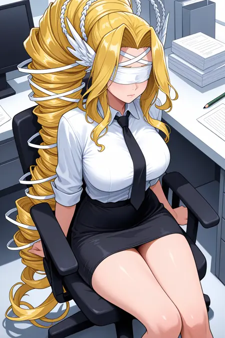 触发词为 "vsmn",且必须包含 "头翼、金发、异常长发、钻头发型、发丝吸入、鬓发、发带、发饰、白色丝带、眼罩"。