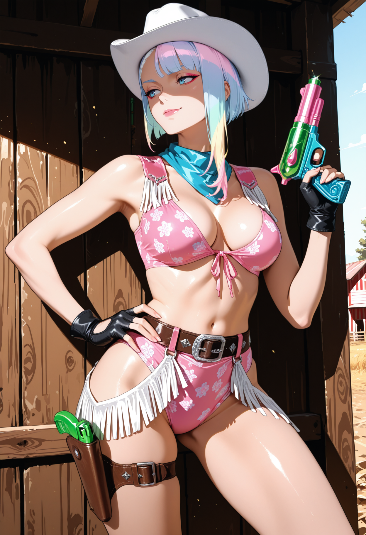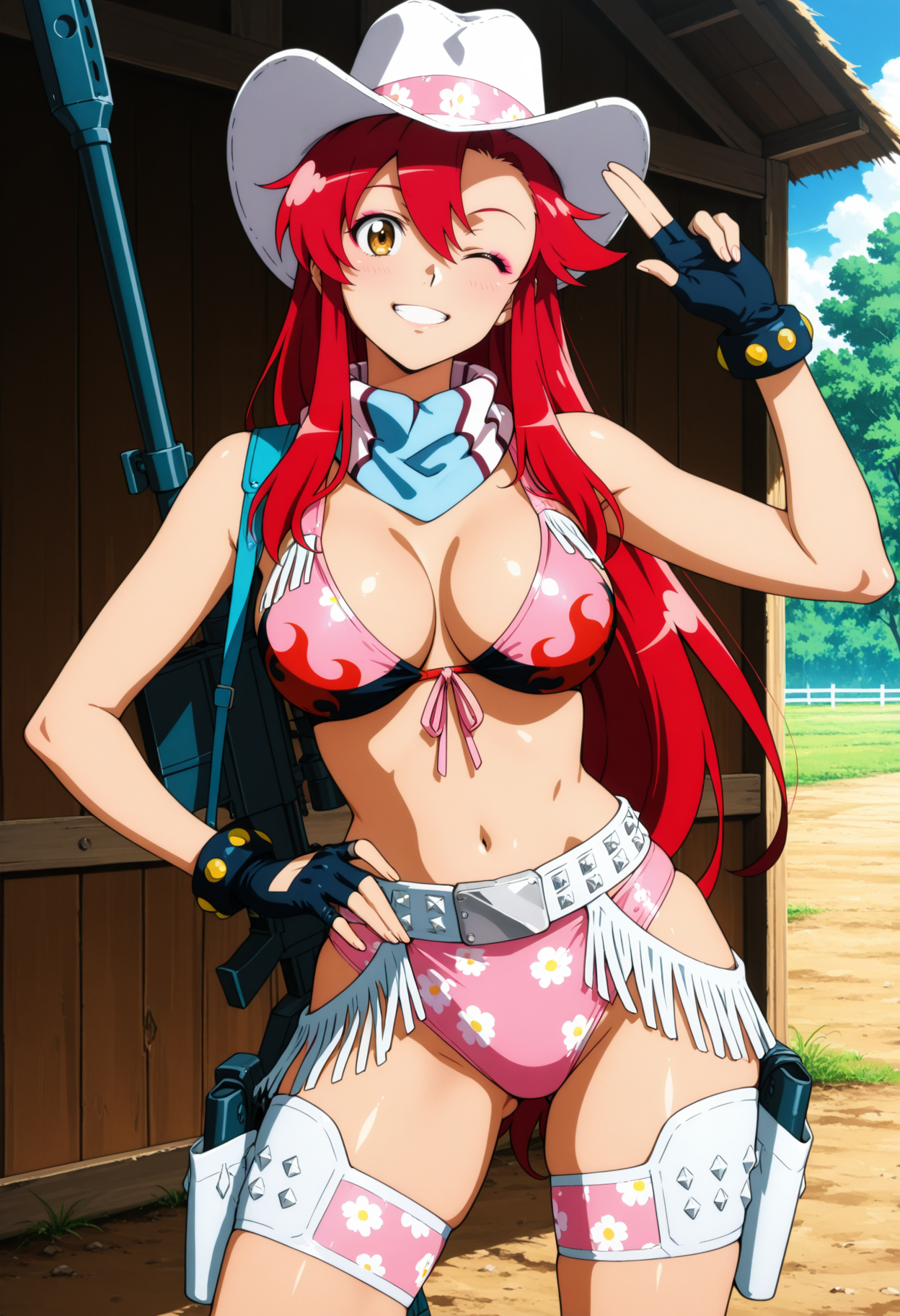 ベルト、白いパイスリー柄、ピンクのビキニ、ピンクのパイスリー柄パンツ、メイク、青いネッカチーフ、赤髪、カールした髪、長い髪、フリンジトリム、太ももホルスター、おもちゃの銃を握る