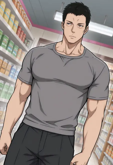 short hair, black hair, grey shirt, black pants, scar under right eye