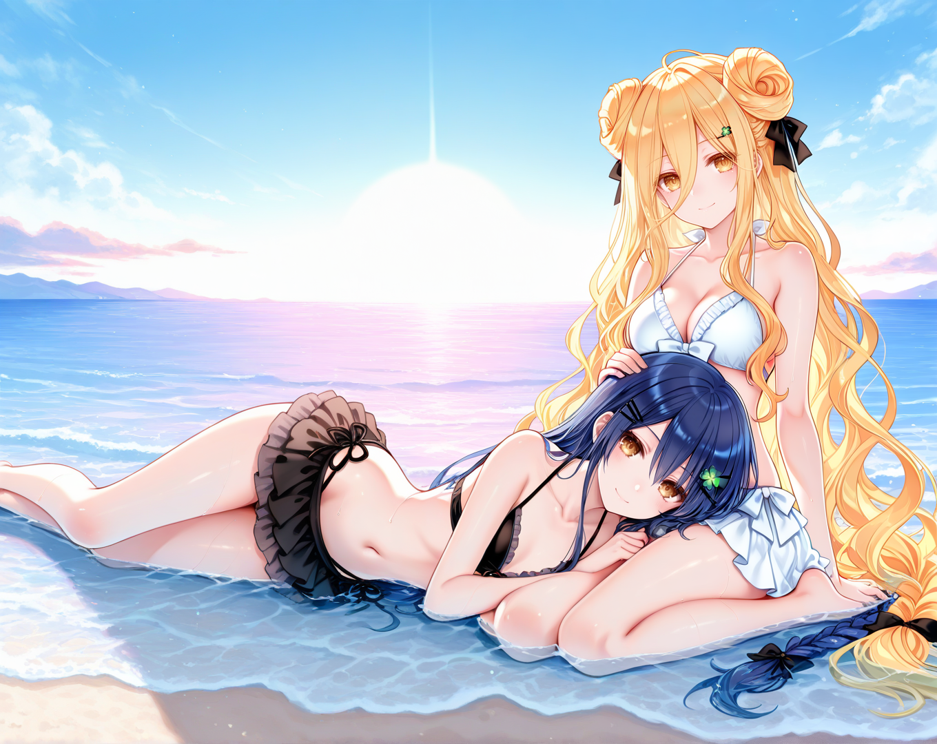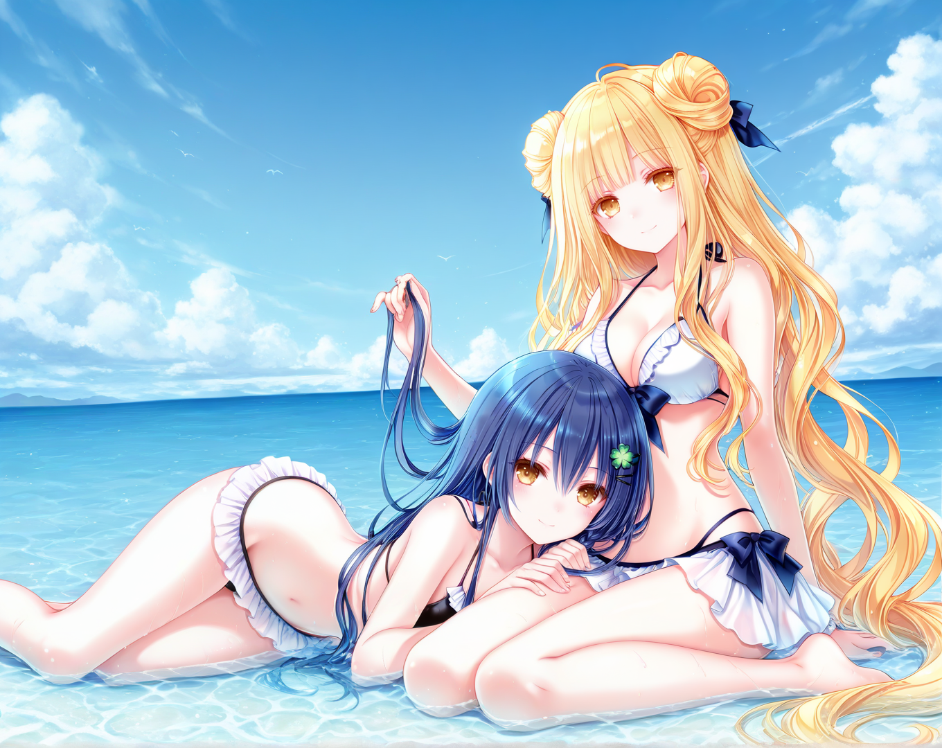 2소녀, 여러 소녀, 호시미야 무쿠로, 이쓰카 시오리, 헤어클립, 금발, 긴 머리, 단일 땋은 머리, 노랑색 눈, 어지럽게 흐트러진 머리, 비정상적으로 긴 머리, 더블 버니, 파란 머리, 갈색 눈, 네 잎 클로버 헤어 장식,