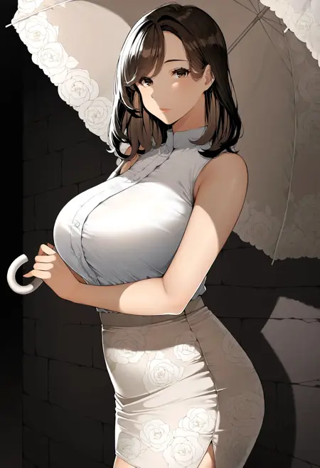 아카네, (1girl, 중간 길이 머리, 갈색 머리, 갈색 눈, 큰 가슴, 거대한 가슴, 성숙한 여성).