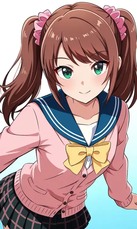 학교 유니폼, 세라후쿠, 파란 해군풍 칼라, 견갑골, 체크무늬 옷, 체크스커트, 검은 스커트, 주름스커트, 분홍 카디건, 노란 리본, 노란 넥타이, 단추,
