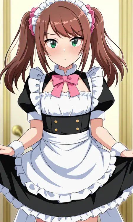 모자, 모자 리본, 미니 탑햇, 앞치마, 아이돌, 스타팅 브라이티(아이돌마스터), 검은 드레스, 분홍 베스트, 퍼프 짧은 소매, 분홍 베스트, 흰색 셔츠, 검은 리본, 검은 넥타이, 검은 리본,