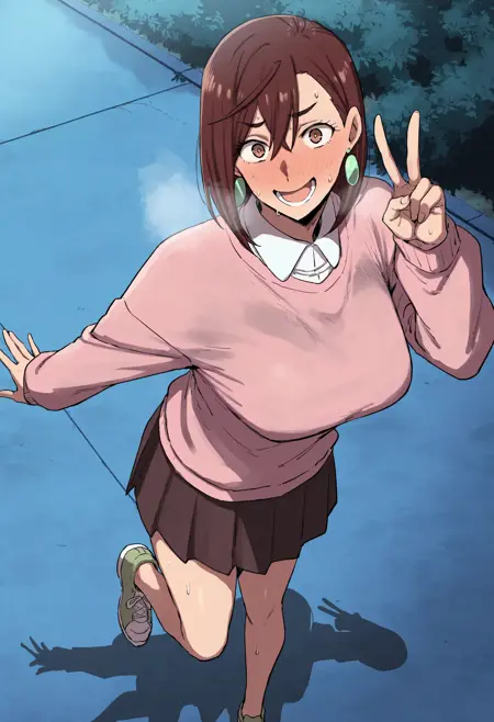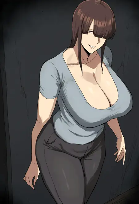 • Momoka, (1girl, long hair, brown hair, hair over one eye, brown eyes, large breasts, huge breasts, mature female).