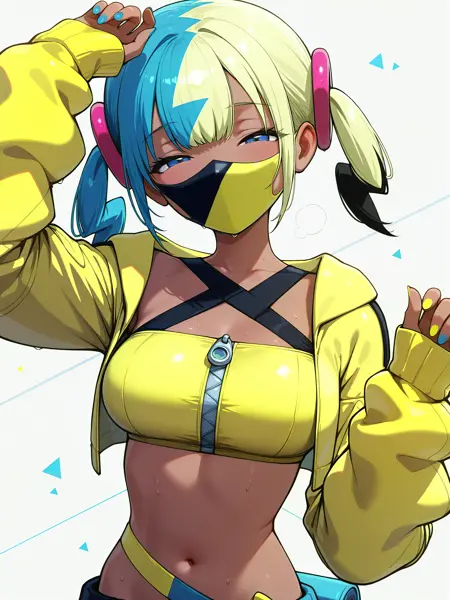 hair ornament, mouth mask, yellow jacket, hooded jacket, open jacket, long sleeves, sleeves past wrists, yellow bandeau, crop top, midriff, zipper, nail polish, yellow nails, blue nails, pants, pouch, belt, white footwear