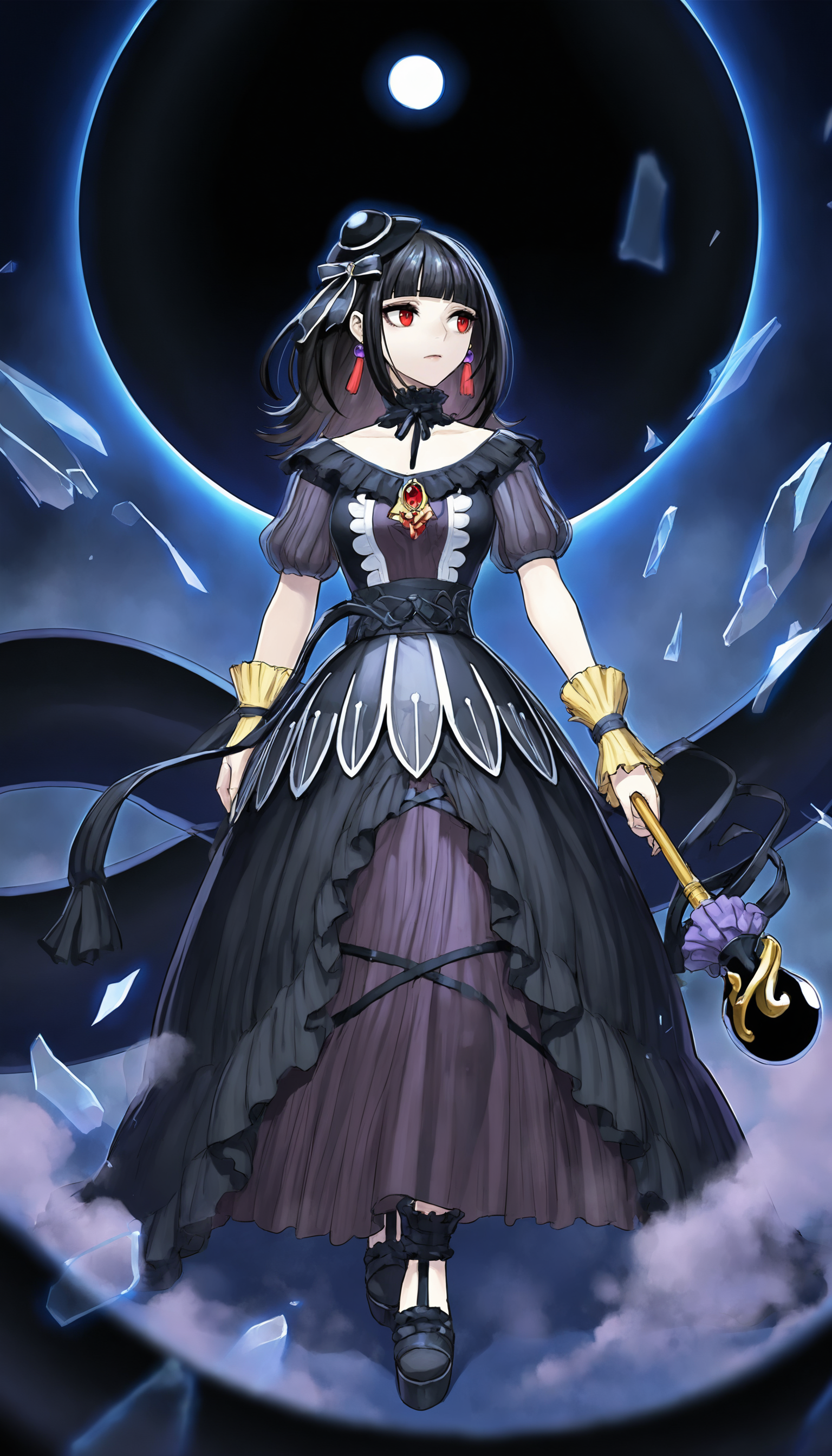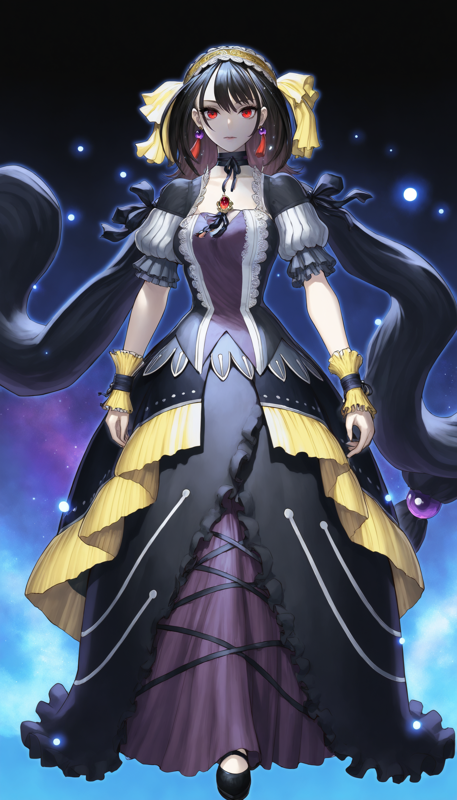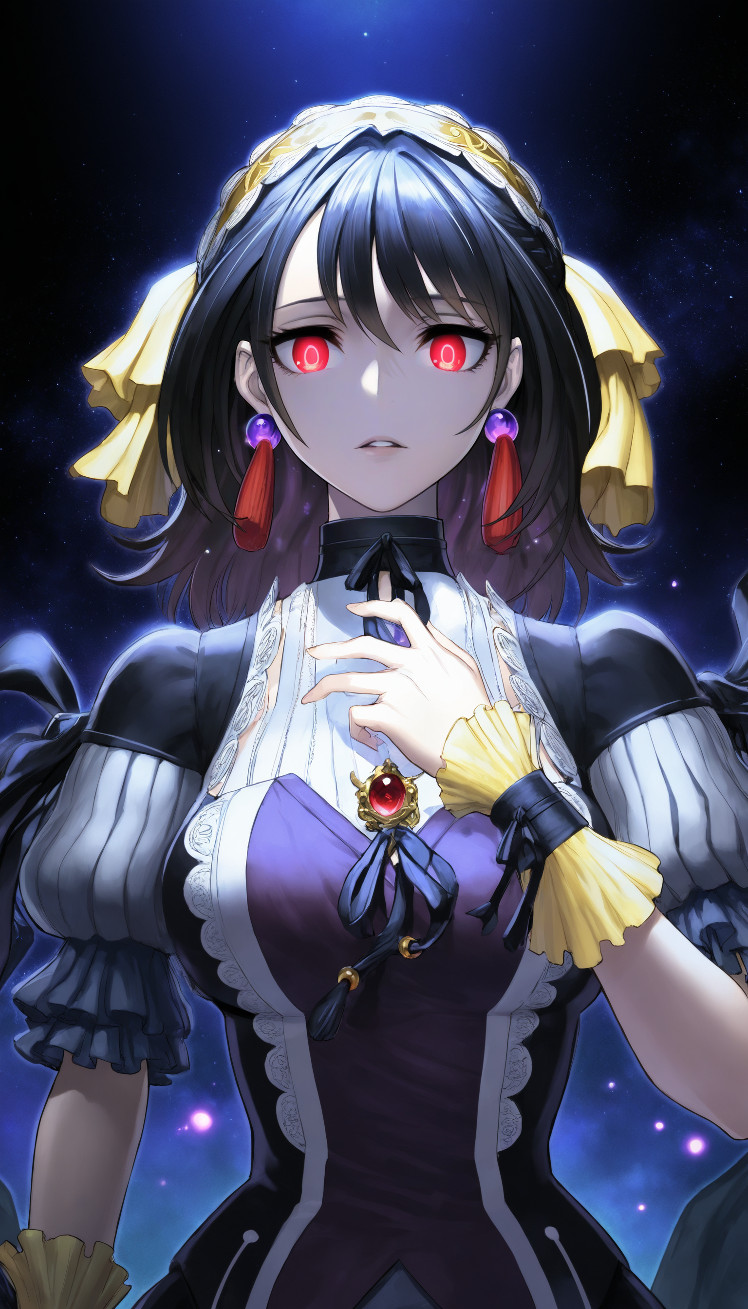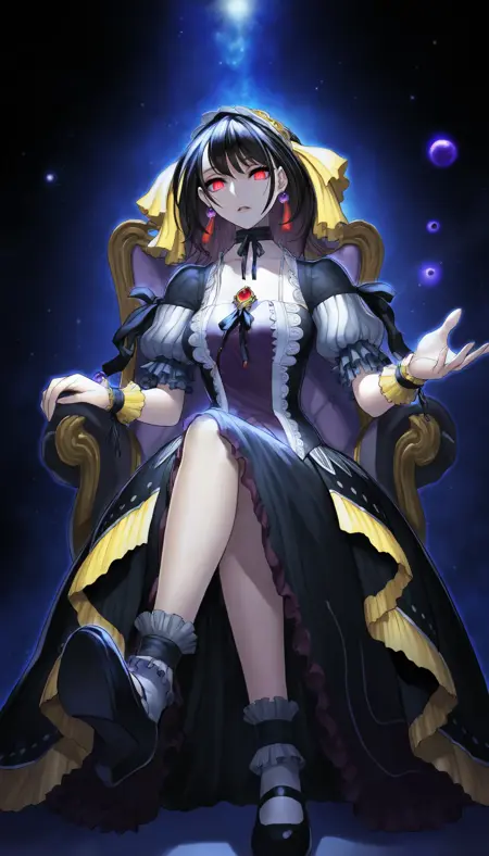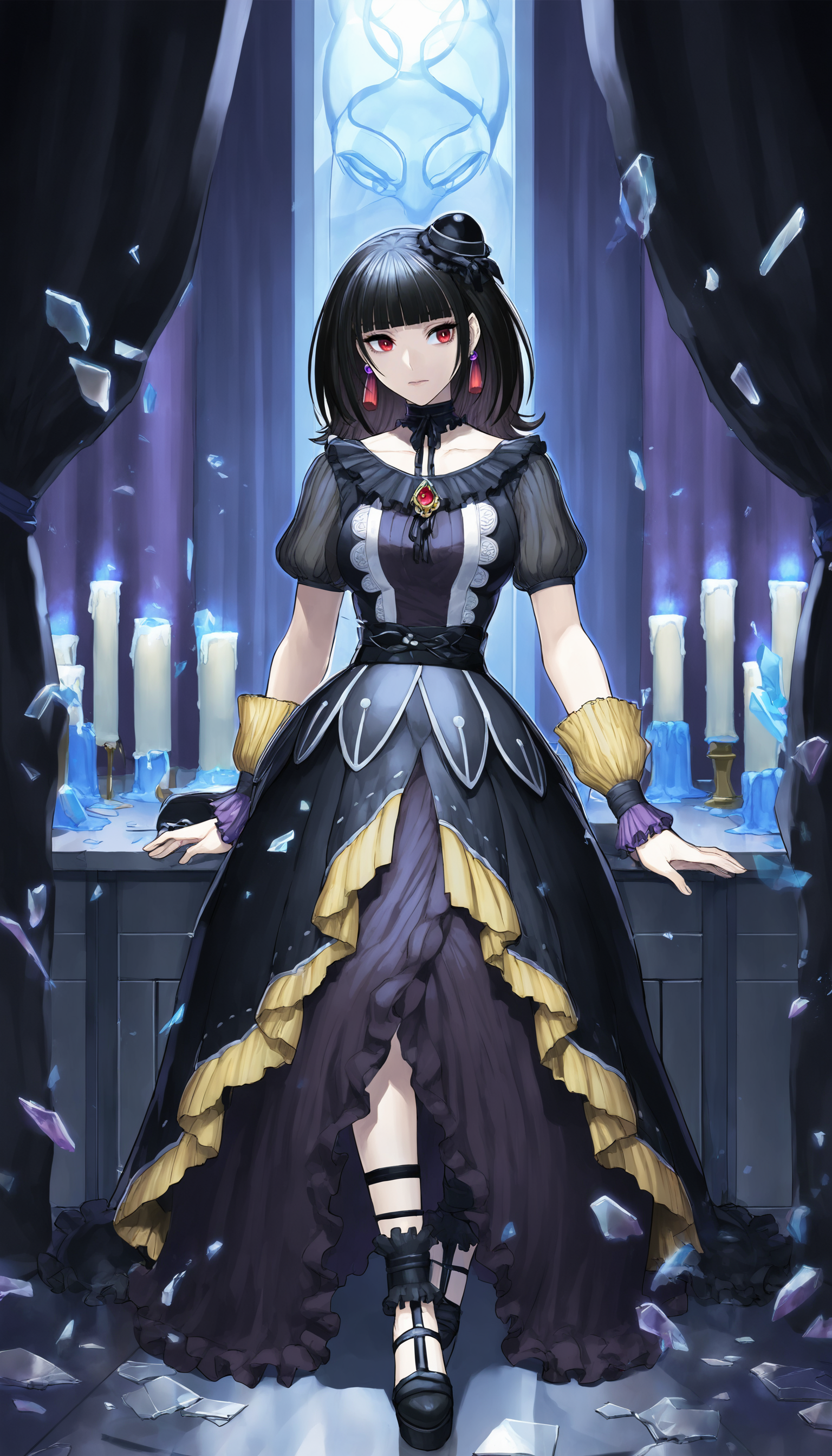 underworldgoddess, black hair, half updo, bangs, red eyes, yellow hairband, red earrings with purple gem, black choker, red gem brooch, black long gown, yellow cuffs, white socks, black shoes