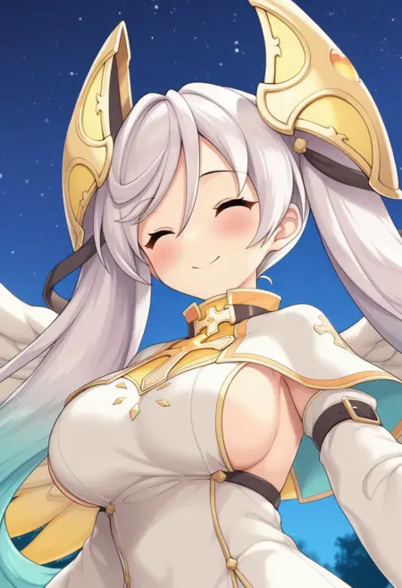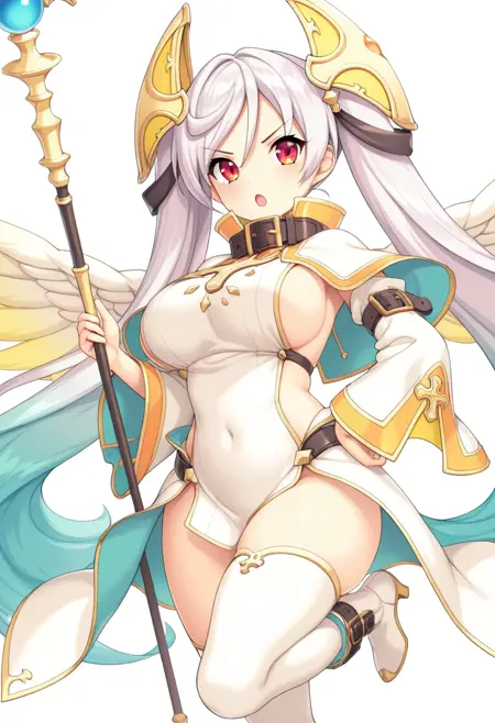 默认服装: legecloMichael, legecloMichael costume1, 1girl, cleric, angel, feathered wings, white wings, yellow wings, long hair, hair ornament, headgear, hair ribbon, hair between eyes, twintails, multicolored hair, gradient hair, white hair, aqua hair, red eyes, two-tone eyes, v-shaped eyebrows, wings, large breasts, white dress, long sleeves, detached sleeves, wide sleeves, belt collar, high collar, collar, belt, buckle, belt buckle, arm belt, two-sided dress, white dress, mint lining, capelet, covered navel, sideboob, sideless outfit, two-tone capelet, pelvic curtain, jewelry, thighhighs, boots, belt boots, white thighhighs, high heels, white footwear, high heel boots, thighs, high-low skirt, waist cape