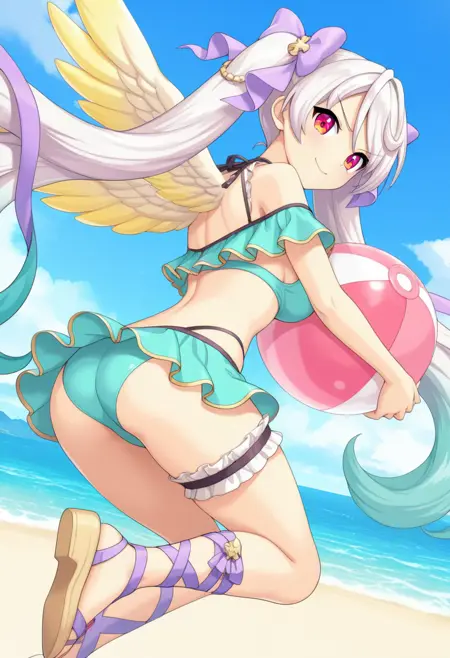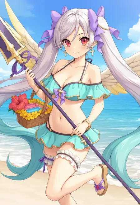 泳装服装: legecloMichael, legecloMichael costume2, 1girl, long hair, cross hair ornament, purple bow, purple hair ribbon, hair between eyes, twintails, multicolored hair, gradient hair, white hair, aqua hair, ribbon, cross earrings, red eyes, looking at viewer, two-tone eyes, closed mouth, v-shaped eyebrows, bare shoulders, wings, feathered wings, white wings, yellow wings, large breast, breast, collarbone, jewelry, gem, swimsuit, bikini, frills, off shoulder, off-shoulder bikini, aqua bikini, bikini skirt, frilled bikini, navel, collarbone, stomach, front-tie bikini top, flower, bracelet, sandals, thigh strap, bridal garter, thigh strap tassel, cross-laced footwear, ankle lace-up, toes, gladiator sandals