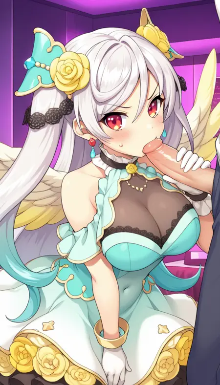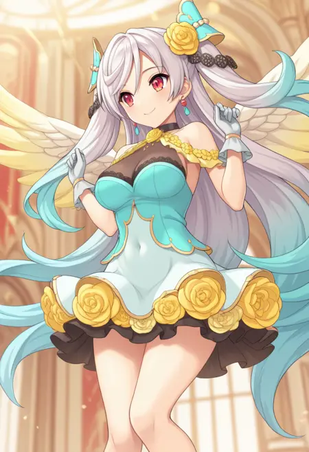 周年纪念服装: legecloMichael, legecloMichael costume5, 1girl, long hair, breasts, large breasts, hair ornament, gloves, red eyes, idol outfit, bow, hair between eyes, cleavage, jewelry, bare shoulders, very long hair, medium breasts, aqua hair, white hair, grey hair, flower, multicolored hair, earrings, frills, wings, shoes, sleeveless, white gloves, hair flower, black footwear, white dress, two-tone dress, two-tone hair, high heels, bracelet, two side up, v-shaped eyebrows, see-through, clothing cutout, sleeveless dress, bare legs, covered navel, gradient hair, aqua hair, aqua dress, rose, halterneck, short dress, frilled dress, feathered wings, white wings, yellow flower, anklet, shoulder cutout, layered dress, yellow footwear, see-through cleavage, pumps, yellow rose, aqua dress, yellow wings, dress flower, patterned ribbon, red earrings, aqua earrings,