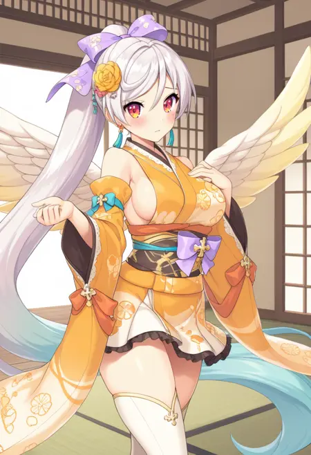 和服服装: legecloMichael, legecloMichael costume3, 1girl, long hair, breasts, large breasts, long sleeves, hair ornament, red eyes, thighhighs, bow, ribbon, jewelry, bare shoulders, very long hair, medium breasts, aqua hair, white hair, grey hair, ponytail, flower, multicolored hair, hair bow, tassel earrings, wings, one eye closed, detached sleeves, japanese clothes, sleeveless, fang, hair flower, wide sleeves, white thighhighs, red eyes, sleeves past wrists, sash, gradient hair, sideboob, sandals, floral print, obi, tassel, feathered wings, purple bow, white wings, spear, geta, tabi, absurdly long hair, toeless legwear, print kimono, short kimono, platform footwear, zouri, sleeveless kimono, kimono, okobo, kimono skirt, yellow wings, print bow, orange kimono