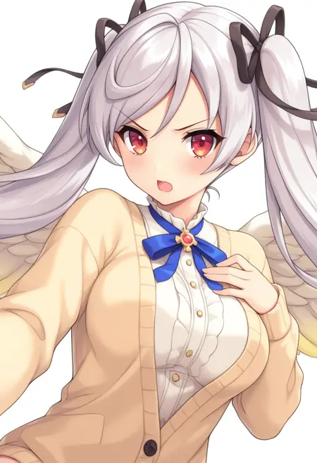 女学生服装: legecloMichael, legecloMichael costume6, 1girl, long hair, shirt, large breasts, skirt, long sleeves, hair ornament, red eyes, thighhighs, bow, ribbon, hair between eyes, closed mouth, cleavage, very long hair, twintails, aqua hair, school uniform, white shirt, white hair, grey hair, hair ribbon, multicolored hair, pleated skirt, frills, wings, shoes, collared shirt, hand up, miniskirt, black footwear, white thighhighs, two-tone hair, blue skirt, v-shaped eyebrows, sleeves past wrists, hand on own hip, zettai ryouiki, plaid, neck ribbon, blue neck ribbon, black hair ribbon, gradient hair, dress shirt, buttons, skindentation, brown footwear, plaid skirt, cardigan, frilled skirt, loafers, feathered wings, angel wings, center frills, shoe soles, brown cardigan, yellow wings, white wings