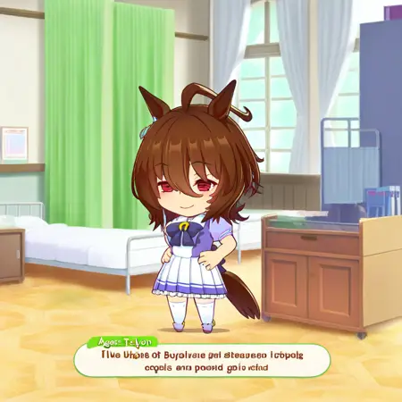 Short brown hair, hair accessory, brown eyes with orange horizontal stripes, single ahoge, hair bangs in front of forehead, Agnes Tachyon, Umamusume, horse ears