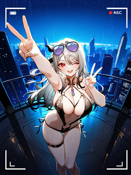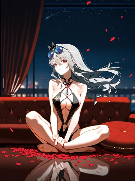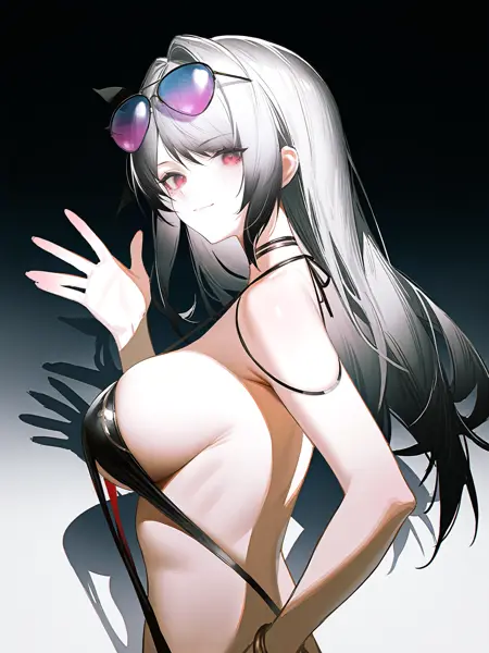 프롬프트: Nerida, Nerida-Styx_Envoy_(Sunspray Surge), red eyes, grey hair, solo, eyewear on head, black swimsuit, black hair ornament, side braid