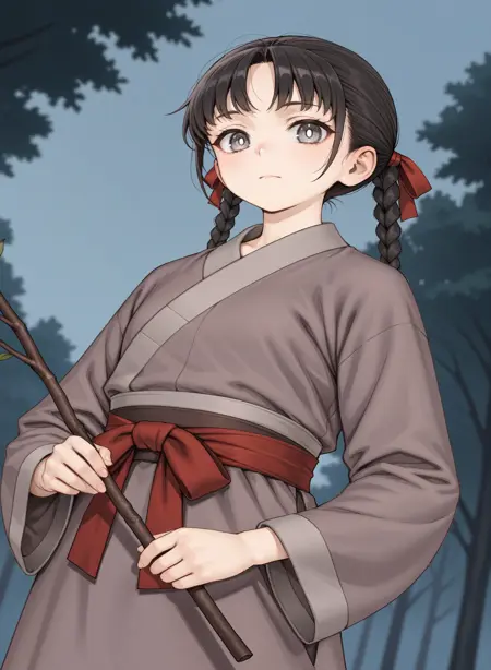 캐릭터1girl, solo, braid, twin braids, holding, looking at viewer, black hair, smile, stick, closed mouth, holding branch, red ribbon, holding stick, hair ribbon, long hair, ribbon, unsang_clothes, unsang1girl, solo, braid, twin braids, looking at viewer, closed mouth, black hair, red ribbon, hair ribbon, own hands together, ribbon, sash, bright pupils, long hair, upper body, mole, unsang_clothes, unsang