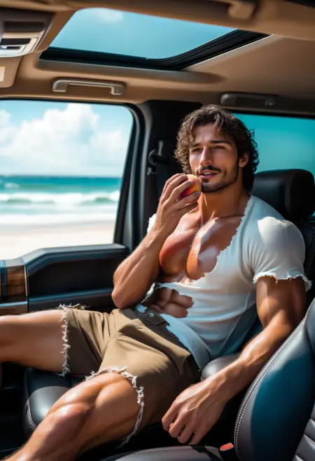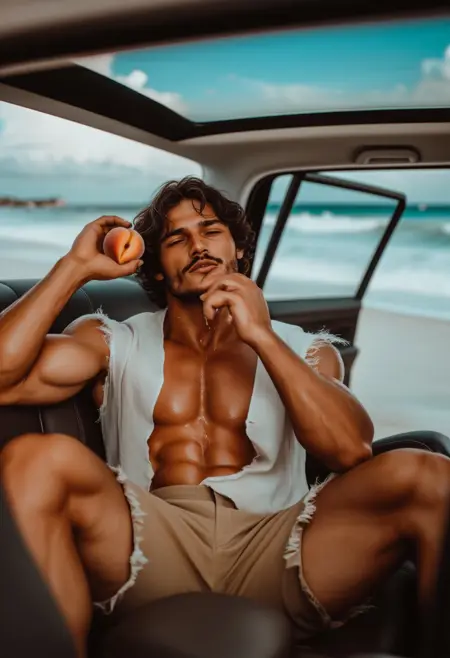 따뜻한 지중해 조명; 해변가 별장, 고급 스튜디오, 햇살이 비치는 테라스 등 현대적이거나 자연스러운 배경. 분위기는 화려하고 세련되며, 힘, 아름다움, 교양의 균형을 갖춘 모습이다.