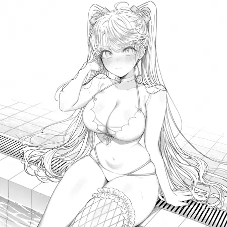swim: naneswi, twintails, choker, bikini, cleavage, swimsuit, frills, frilled tighhighs, fishnet, fishnet tighhighs