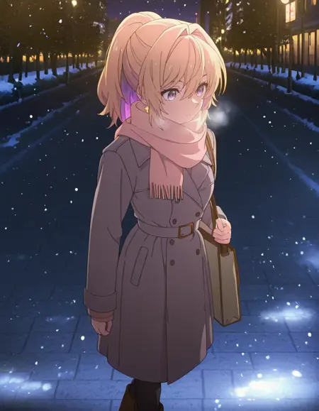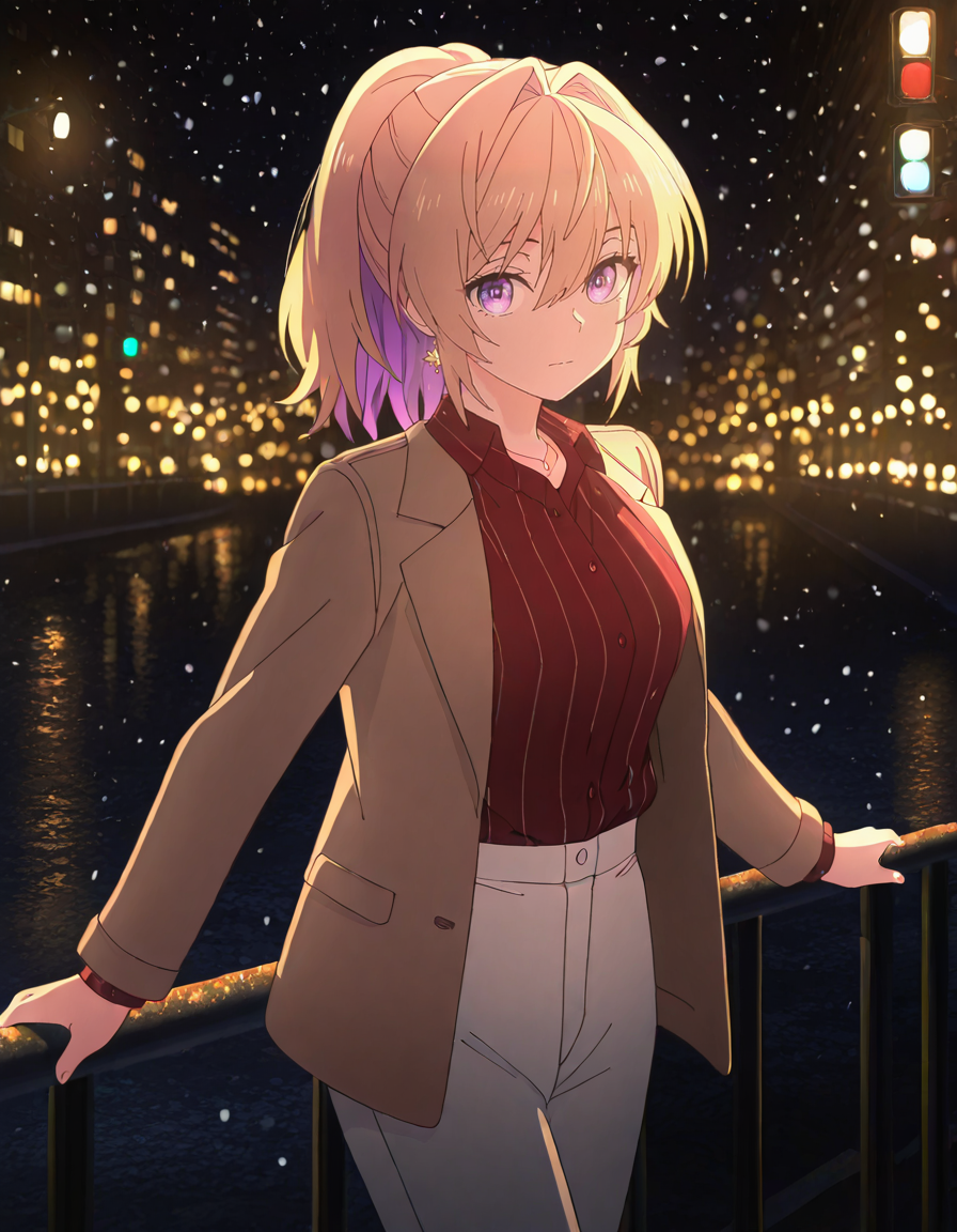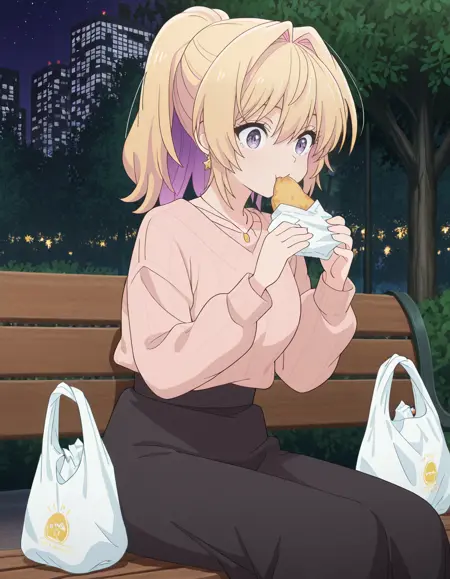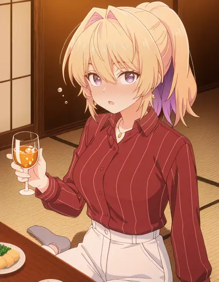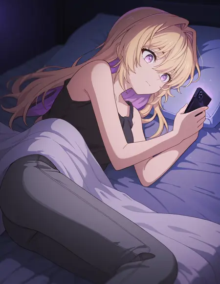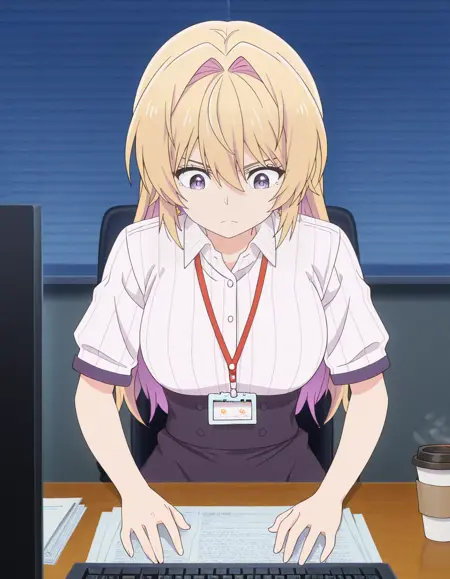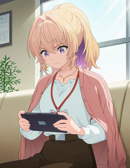 <lora:azusa_kannawa-bukiyou_na_senpai_s1-ixl-anime-soralz:1>, azusa kannawa (bukiyou na senpai), 다른 헤어스타일, 긴 머리, 금발, 다색 머리, 내부 색상 머리, 보라색 머리, 꼬리머리, 머리가 얼굴을 가림, 눈 사이의 머리, 보라색 눈