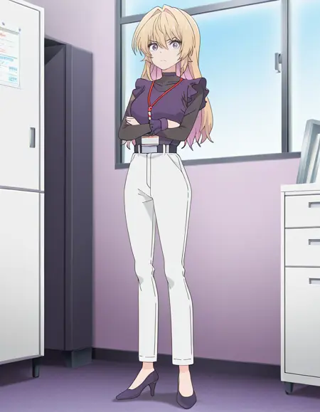 별 모양 귀걸이, 업무 복 1, 목뼈 덮개, 계층적 셔츠, 보라색 상의, 프릴, 보라색 목걸이, 검은 터틀넥, 긴 소매, 벨트, 긴 바지, 보라색 팔목 장식, 흰색 바지, 보라색 하이힐