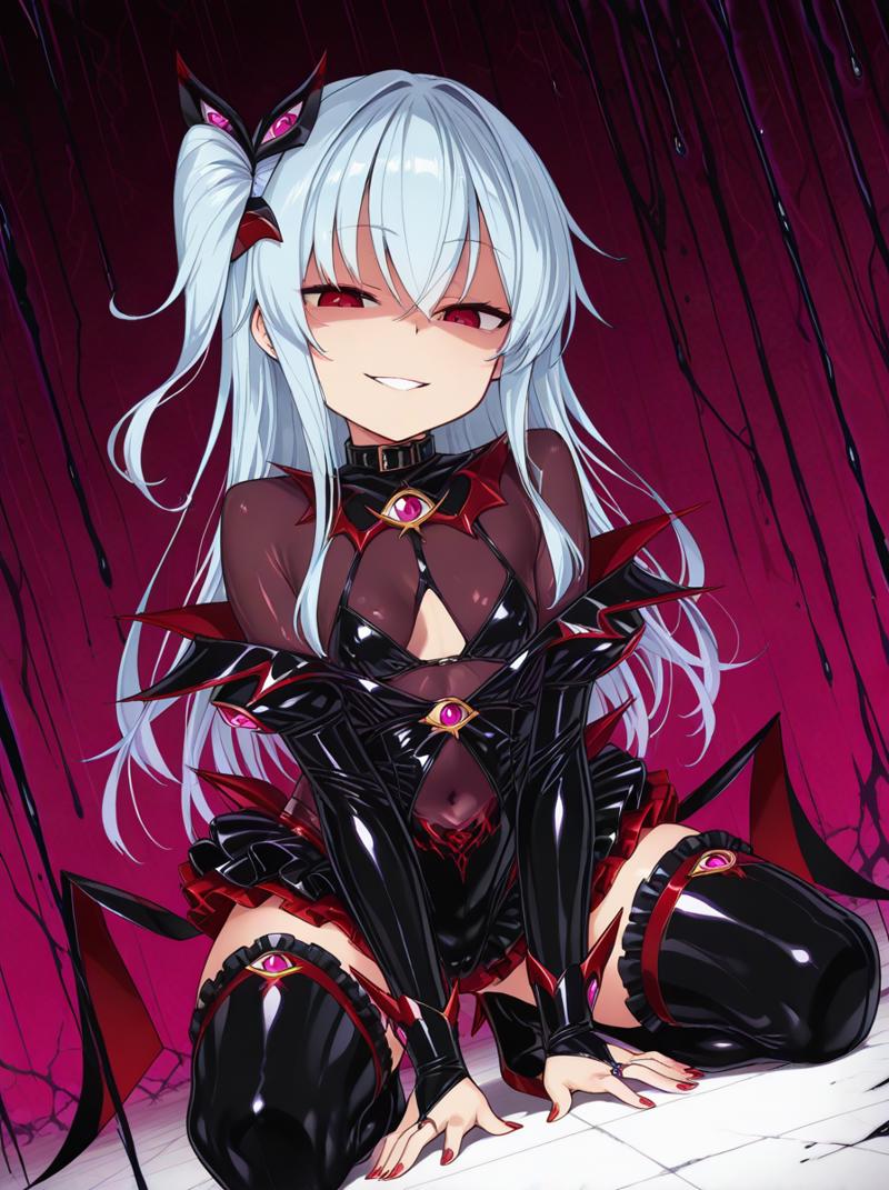 触发词:saccumare lapis服装、项圈、蝴蝶结、大腿靴、高跟鞋、单侧露肤、肚脐、胸线、下胸围,