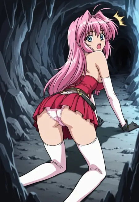 헤어밴드, 분리형 목걸이, 분홍색 버스티에, 어깨 노출, 활, 분리형 소매, 장갑, 치마, 벨트, 흰색 허벅지까지 오는 양말, 귀걸이,