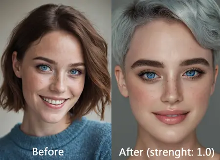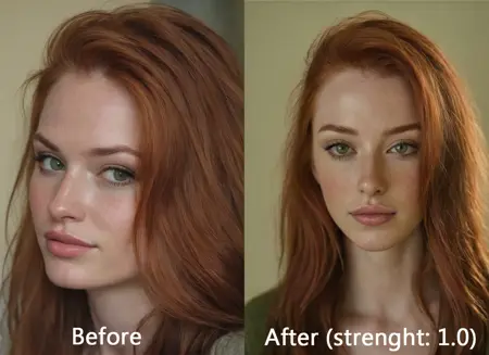 강도를 1.0보다 높게 사용하지 않는 것을 권장합니다. 특히 강도를 1 이상으로 설정하여 눈동자 색상을 상세히 조정하면 홍채가 왜곡되는 경향이 있기 때문입니다. 강도는 0.5에서 0.8 사이로 사용하는 것을 추천합니다.