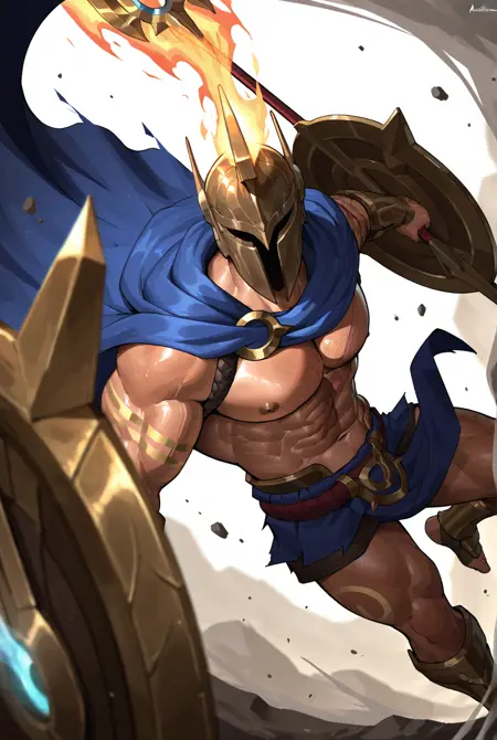manly, muscular, muscular male, abs, pectorals, large pectorals, bare pectorals, navel, scar, bara, cape, blue cape, armor, pelvic curtain, belt