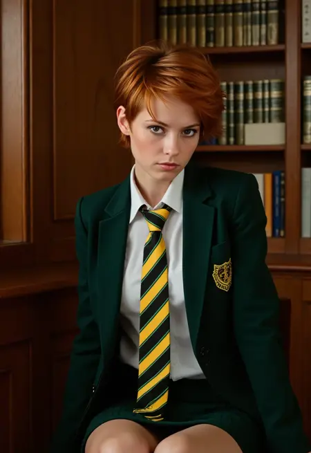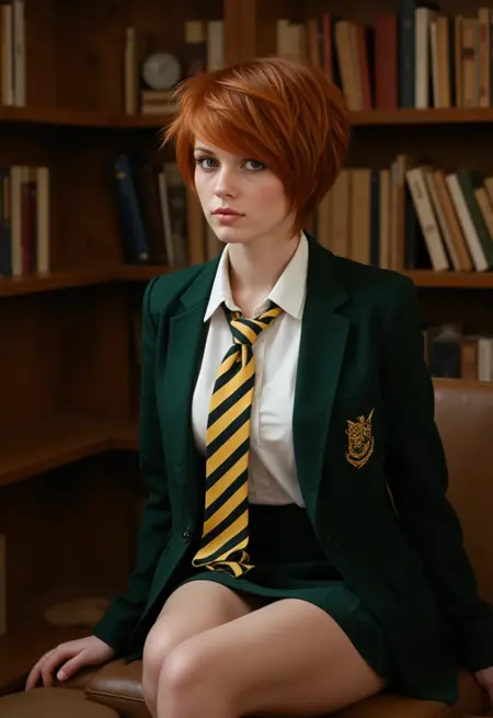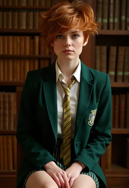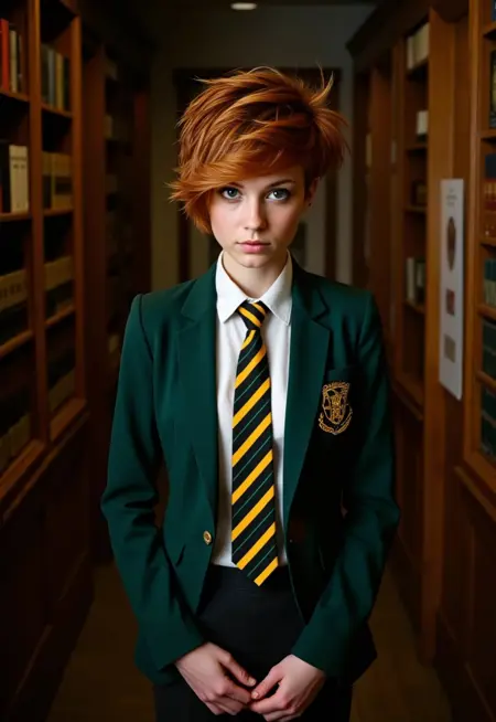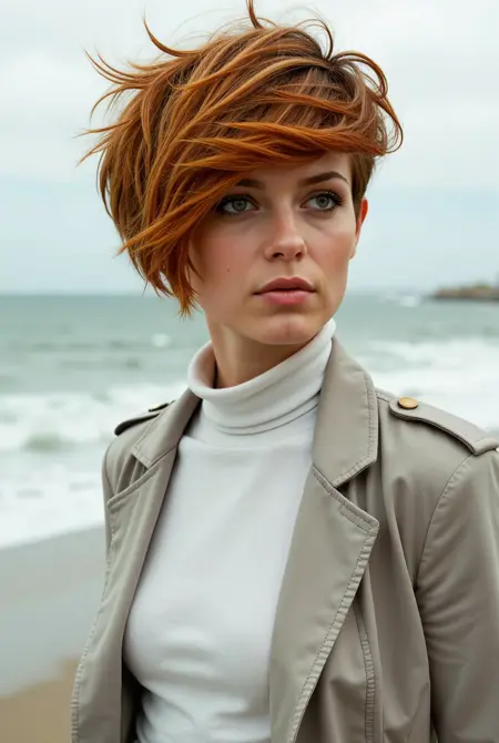 髪: 赤茶色、乱れた短髪、自然な反骨的な雰囲気