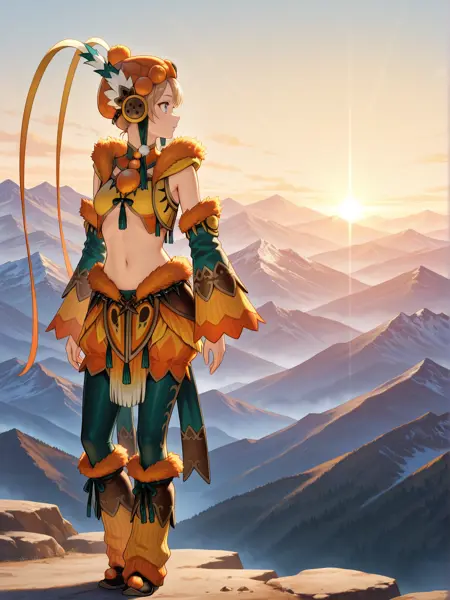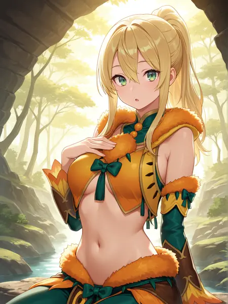태그(의류): 키타와차 갑옷, 주황색 두건, 끈 장식 머리 장식, 주황색 베스트, 주황색 크롭탑, 주황색 분리형 소매, 주황색 반바지, 녹색 바지, 주황색 다리 보호대, 검은 신발