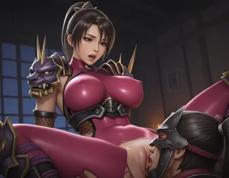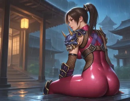 시작 프롬프트: 1girl, taki \(soulcalibur\), 언덕머리, 갈색 눈, 큰 가슴, 갑옷, 닌자, 바디수트, 장갑