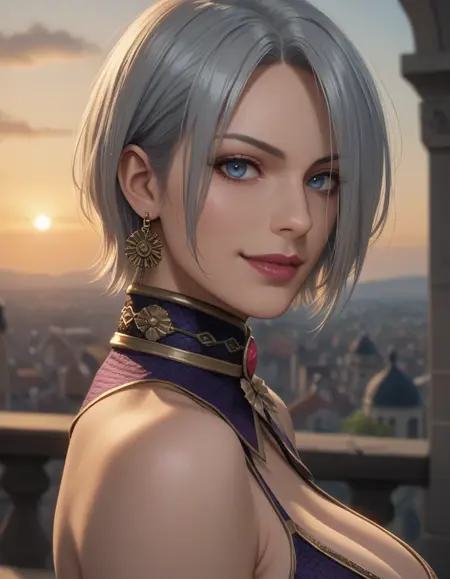• Positive prompt: 1girl, SC4Ivy, short hair, blue eyes, hair over eye, huge breasts, one pauldron, underboob, gauntlet