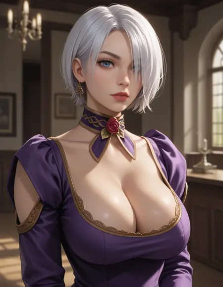 • Positive prompt: 1girl, isabella valentine, short hair, blue eyes, hair over eye, large breasts, cleavage, underboob, armor, revealing clothes, thighhighs, high heels